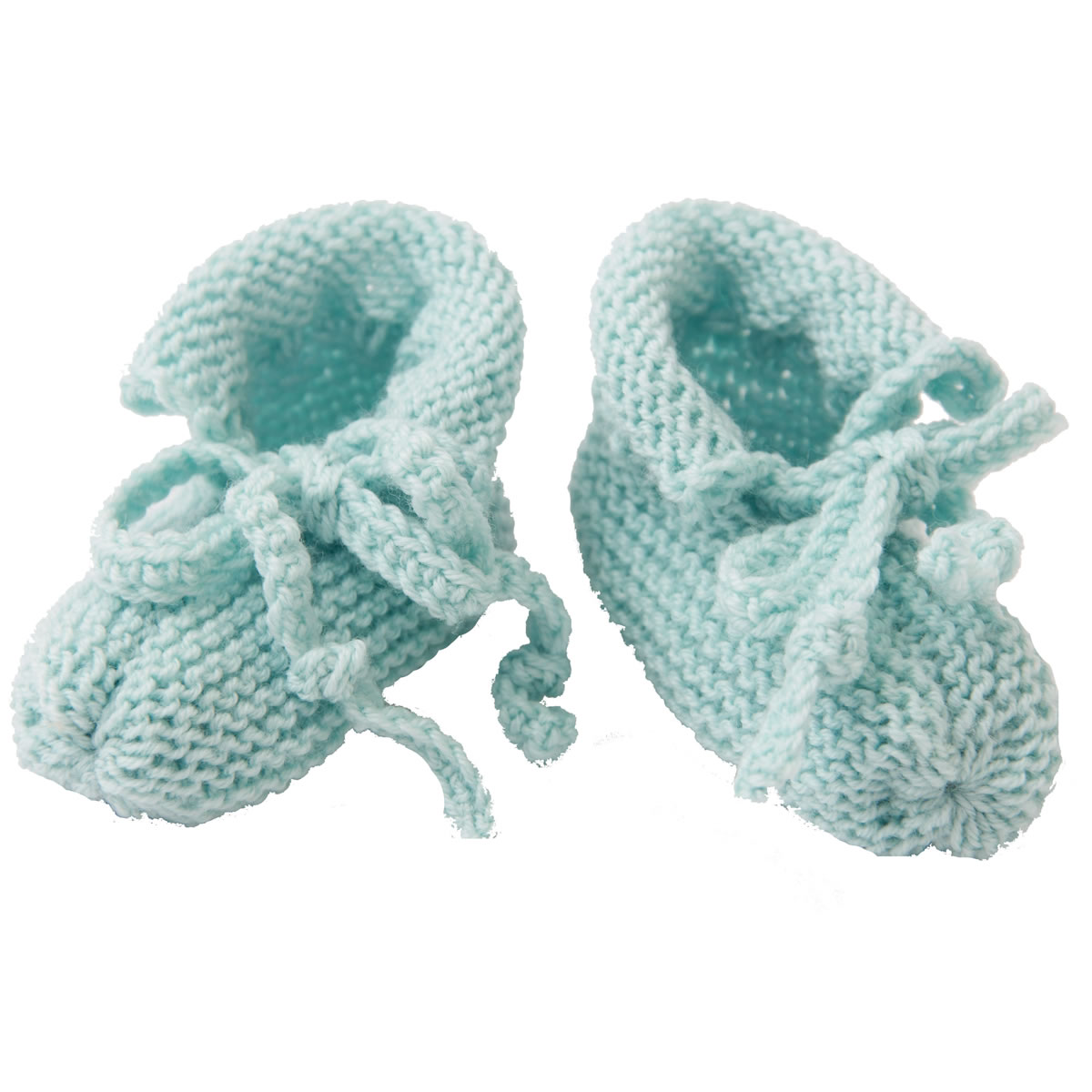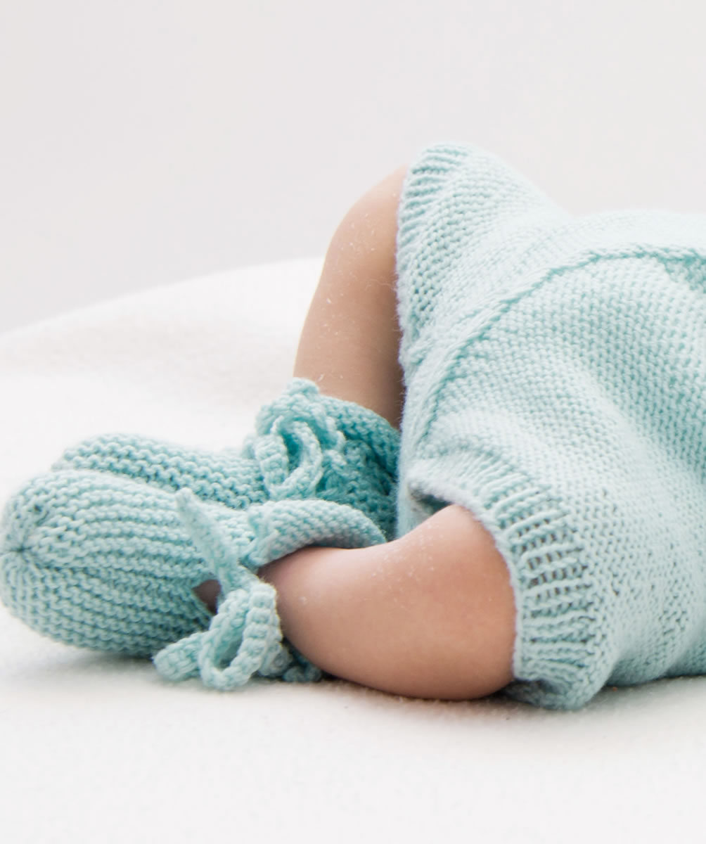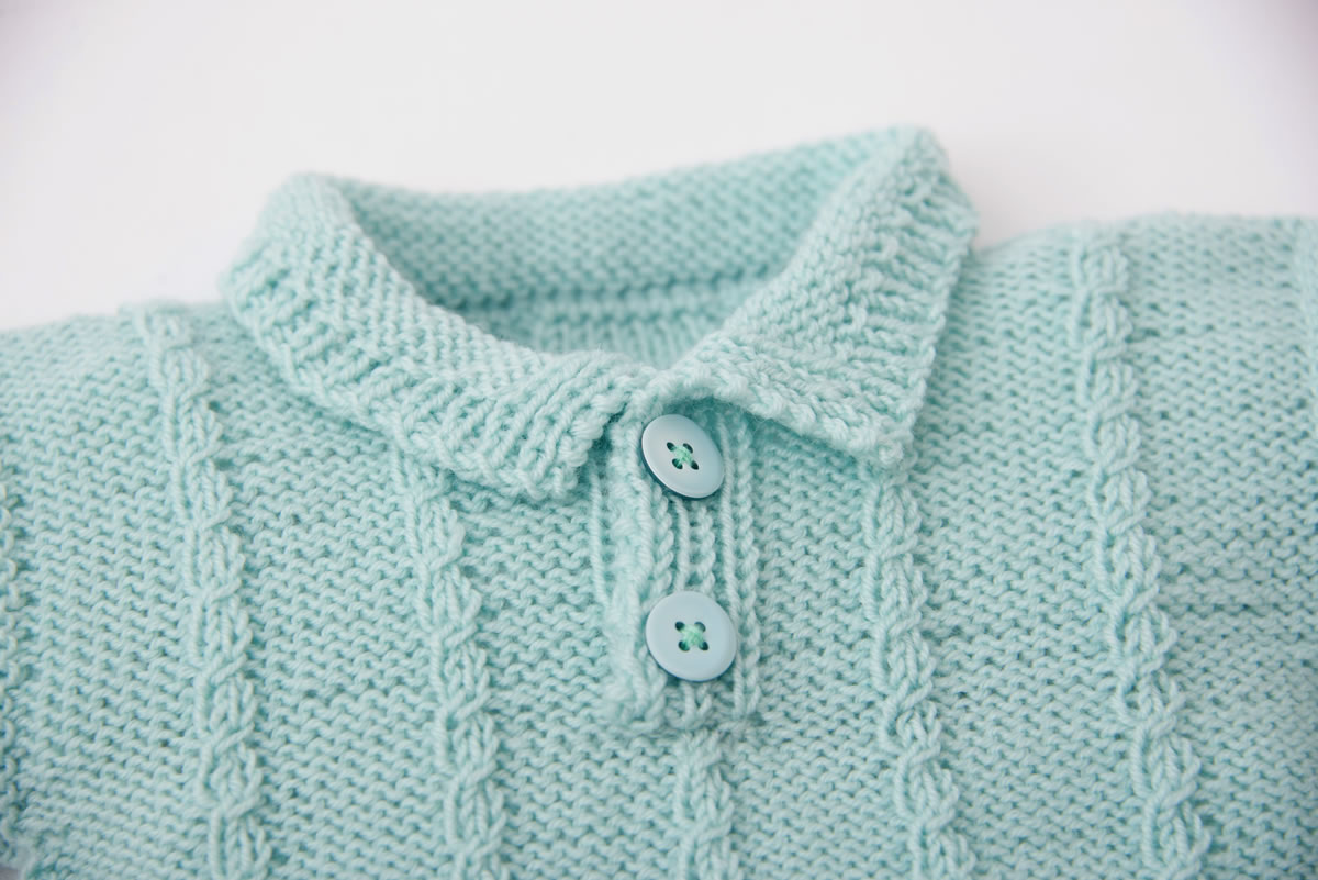 Lana Grossa Qualität „Cool Wool Baby“, 100 % Schurwolle, Lauflänge 220 m/50 g; ca. 100 (150) Helltürkis (Fb 230); eine 40 cm lange Rundstricknadel Nr. 3, eine 60 cm lange Rundstricknadel Nr. 3, eine Häkelnadel Nr. 2,5; 2 Knöpfe und Gummiband.