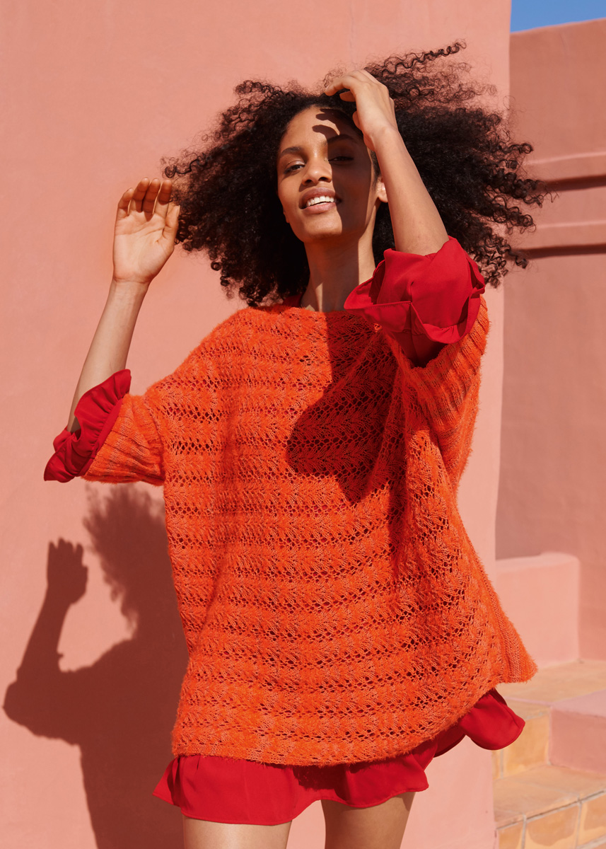 Auffallen gefällig? Im korallenroten Oversized-Pulli klappt das bestimmt. Auf nackter Haut wirkt er schlicht und chic. Trägt man ihn über Teilen in Kontrastfarbe, ergeben sich tolle Changeant-Effekte.