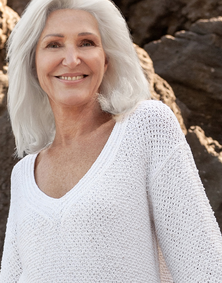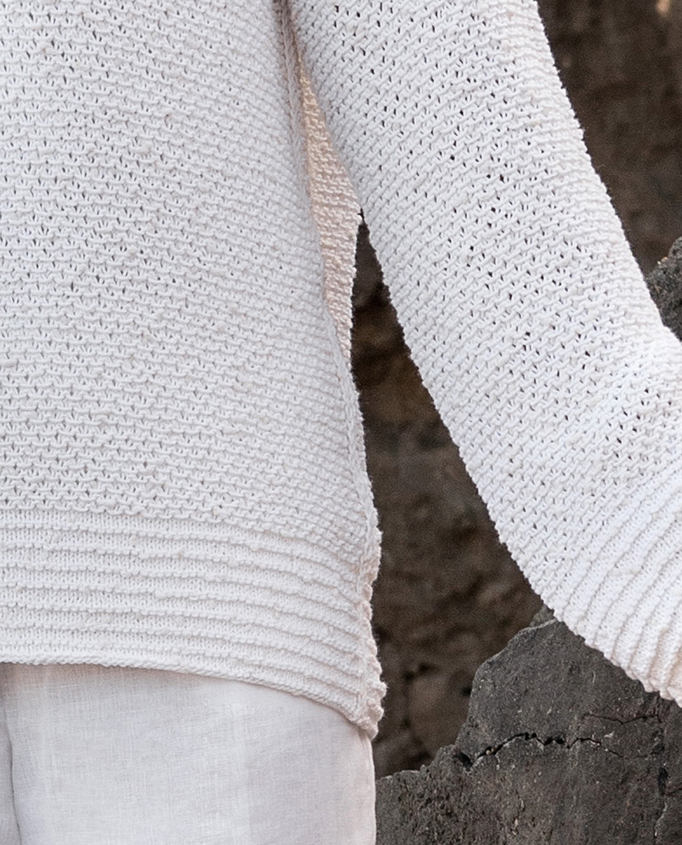 Lana Grossa-Qualität „Bottone” (94 % Baumwolle, 6 % Polyamid, LL = ca. 120 m/50 g): ca. 650 (700 – 750) g Weiß (Fb. 14); Stricknadeln Nr. 3 und 5, 1 Rundstricknadel Nr. 3, 60 cm lang.
