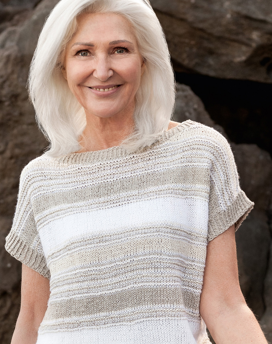 Lana Grossa-Qualität „Ecopuno” (72 % Baumwolle, 17 % Schurwolle (Merino), 11 % (Baby) Alpaka, LL = ca. 215 m/50 g): ca. 100 (150 – 150) g Weiß (Fb. 26), Lana Grossa-Qualität „Linarte” (40 % Viskose, 30 % Baumwolle, 20 % Leinen, 10 % Polyamid, LL = ca. 125 m/50 g): ca. 200 (250 – 250) g Grège (Fb. 45) und Lana Grossa-Qualität „Solo Lino Mélange” (80 % rec. Leinen (Viskose), 20 % Leinen, LL = ca. 105 m/50 g): ca. 100 (150 – 150) g Natur meliert (Fb. 101); Stricknadeln Nr. 4 und 4,5, 1 Rundstricknadel Nr. 4, 60 cm lang.
