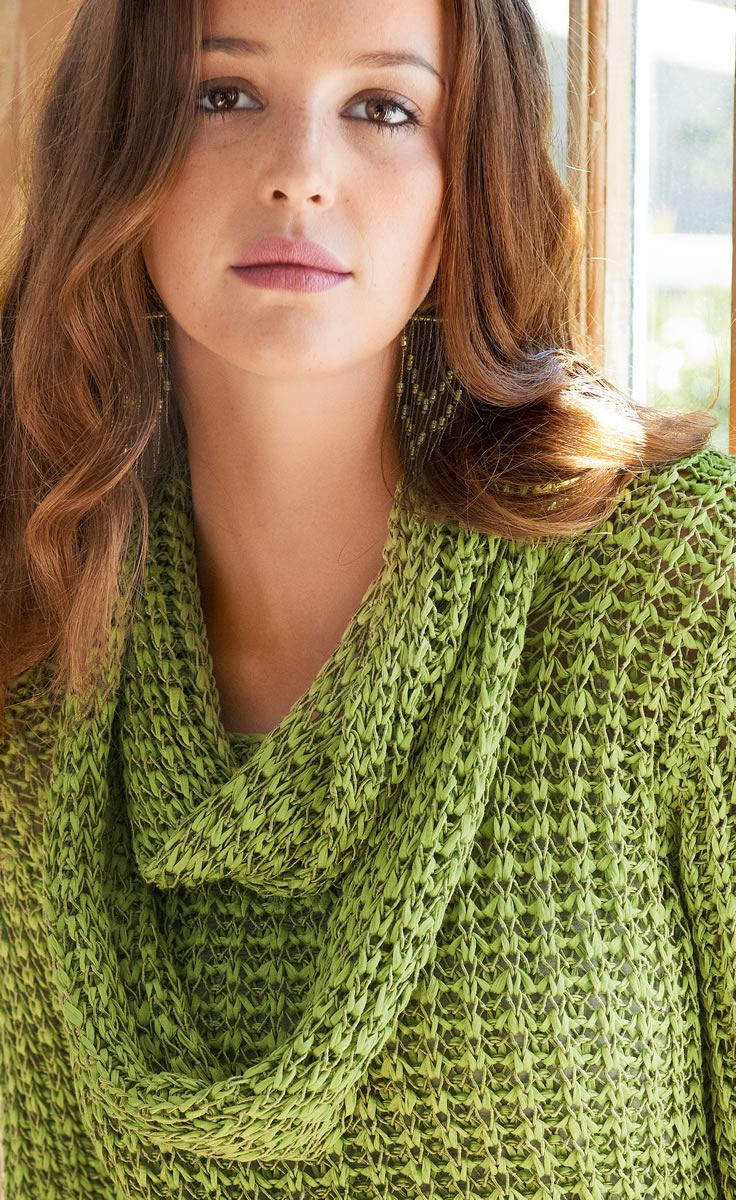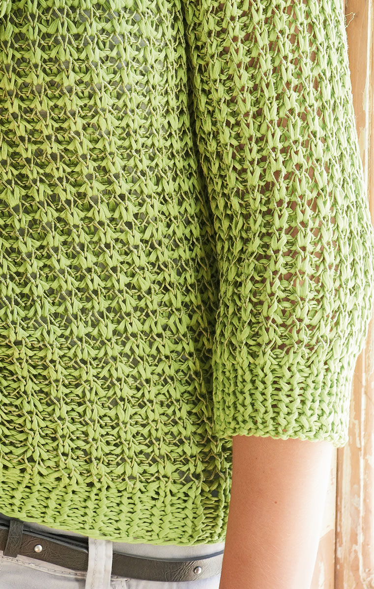Lana Grossa-Qualität „Dacapo” (100 % Baumwolle, LL = ca. 75 m/50 g): ca. 350 (400) g Hellgrün (Fb. 15) und Lana Grossa-Qualität „Secondo Big” (70 % Baumwolle, 15 % Seide, 15 % Polyamid, LL = ca. 90 m/50 g): ca. 300 (350) g Oliv (Fb. 613); Stricknadeln Nr. 4,5 und 5.