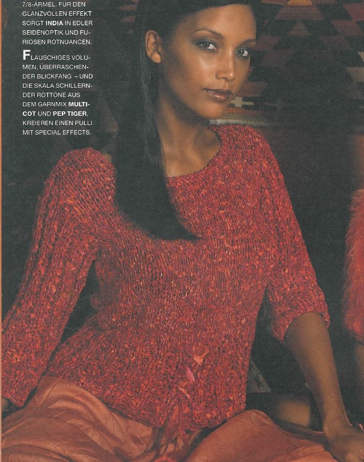 Lana Grossa Qualität India (100% Microfaser Polyamid), ca 450 (500) g Rot/Orange (Fb. 9), Stricknadeln Nr. 10 und 1 Häkelnadel Nr. 6.
