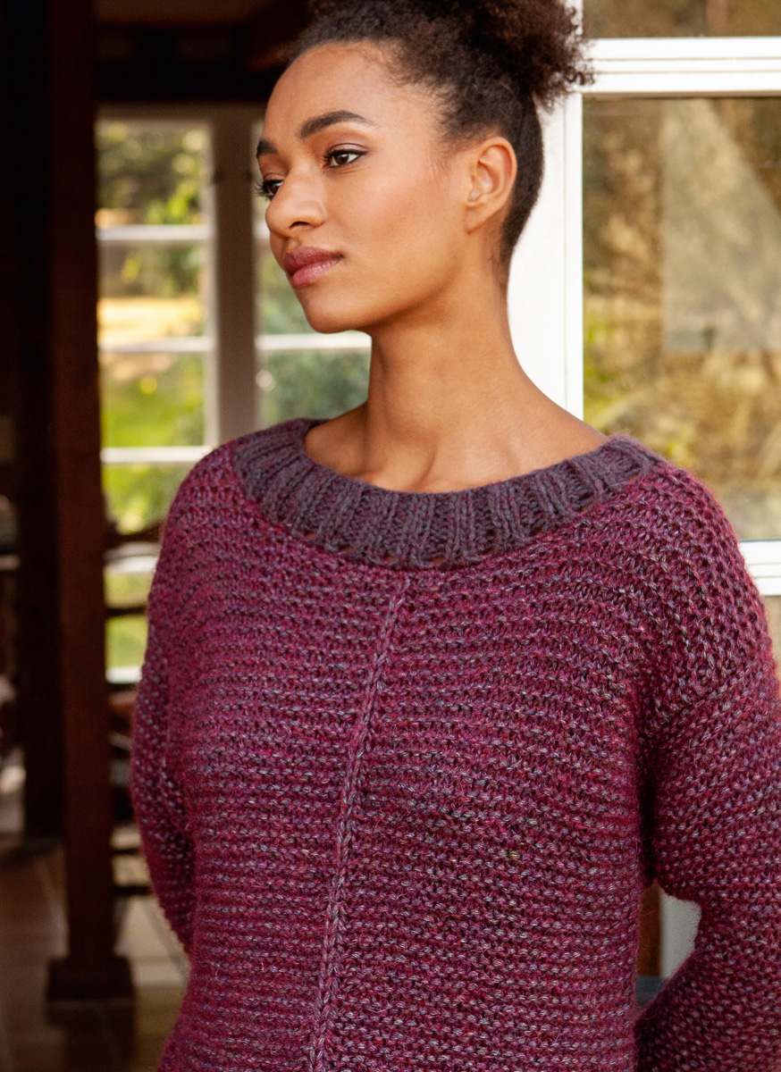 Lana Grossa-Qualität "Insieme” (50 % Schurwolle (Merino 19 micron), 20 % (Baby) Alpaka, 20 % Mohair (Super Kid), 10 % Polyamid, LL = ca. 75 m/50 g): ca. 350 (400 – 450) g Grau/Bordeaux (Fb. 12) und Lana Grossa-Qualität „Cool Air” (55 % Schurwolle (Merino), 33 % (Baby) Alpaka, 12 % Polyacryl, LL = ca. 125 m/50 g): ca. 100 (150 – 150) g Burgund/Dunkelgrau (Fb. 6); Stricknadeln Nr. 7 und 9, 1 Rundstricknadel Nr. 7, 60 cm lang, 1 Wollhäkelnadel Nr. 7