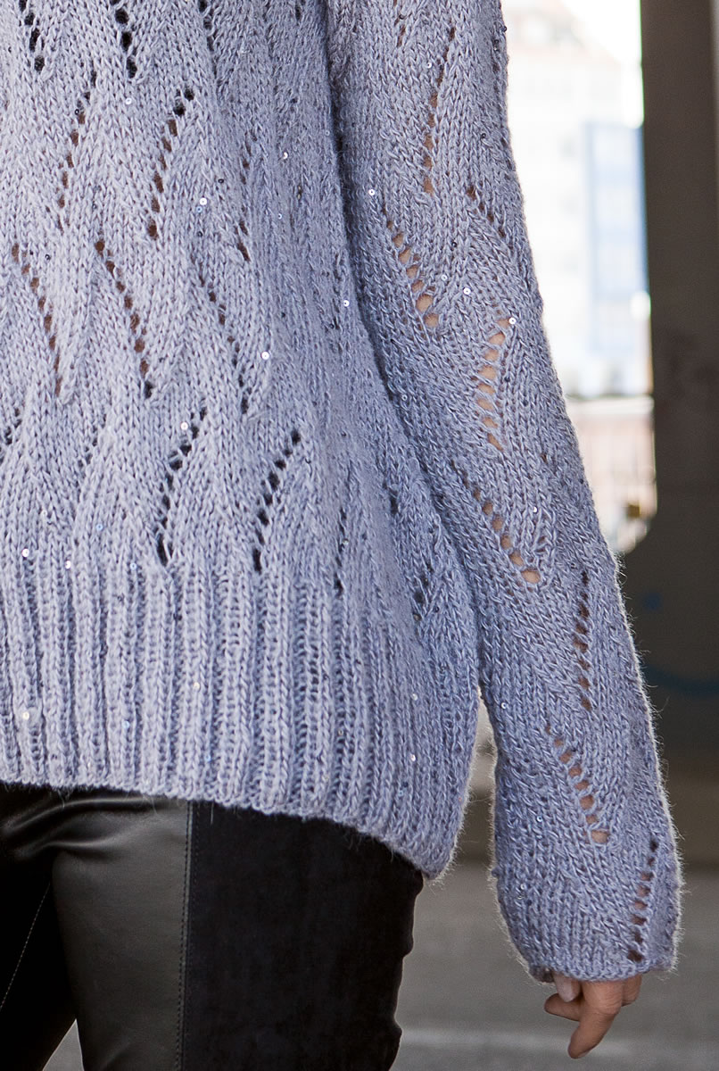 Lana Grossa Lace Seta (70 % Alpaka, 30 % Seide, Lauflänge 250 m/50 g) 200 (250/300) g Lilagrau (Fb 3) und Lace Paillettes (45 % Alpaka, 20 % Schurwolle, 15 % Polyamid, 15 % Baumwolle, 5 % Polyester, Lauflänge 150 m/25 g) 150 (175/200) g Graulila (Fb 26); Stricknadeln Nr. 5 und 5,5, Häkelnadel Nr. 5