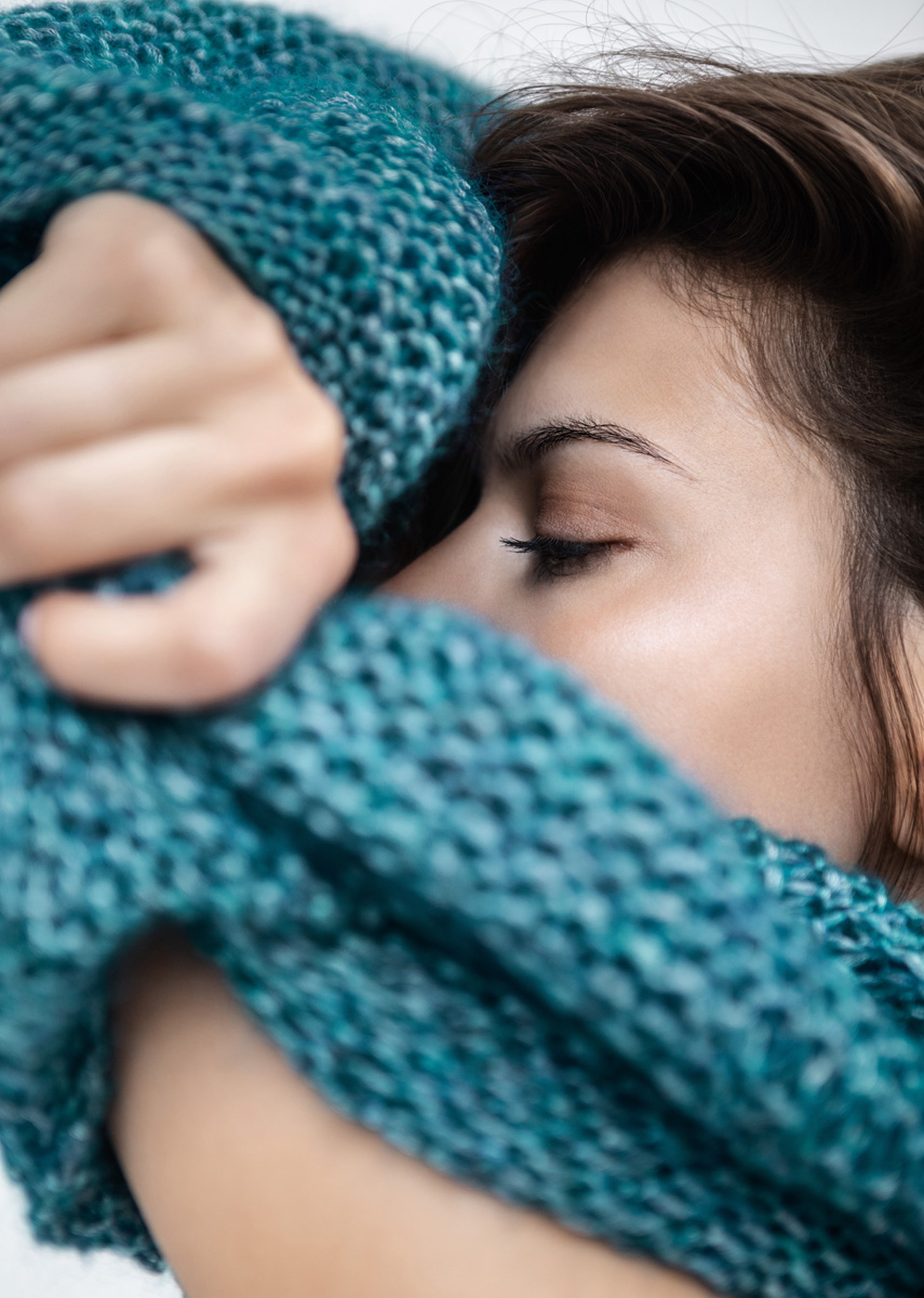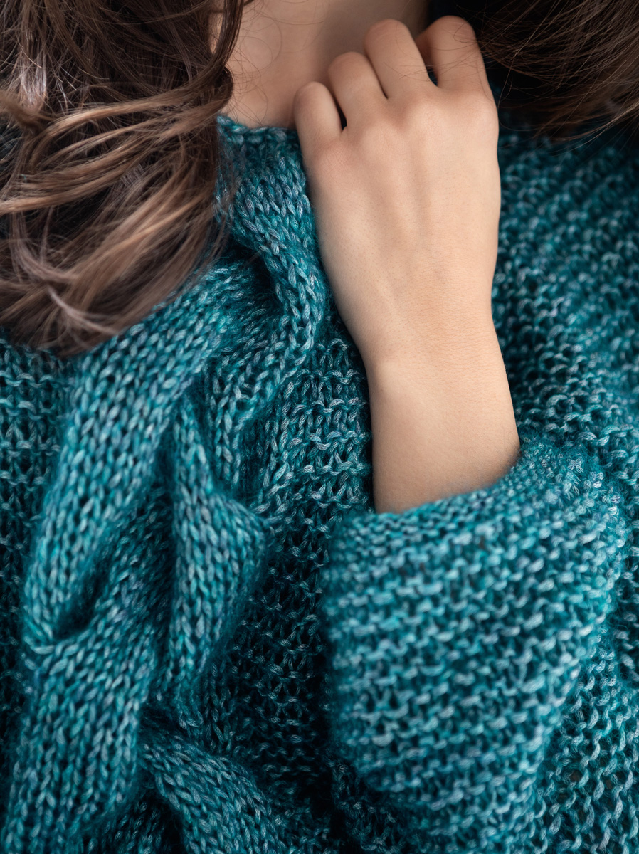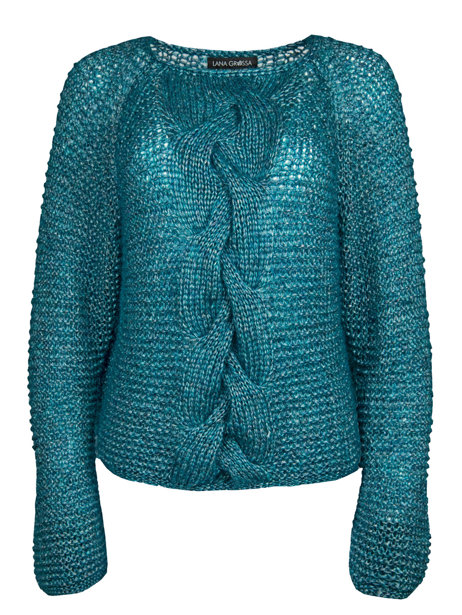Lana Grossa Mia (30 % Mohair, 26 % Schurwolle, 25 % Seide, 19 % Polyamid, Lauflänge 105 m/25 g) 250 (275 – 300) g Petrol (Fb 4); Stricknadeln Nr. 5 und 9, eine Häkelnadel Nr. 6.