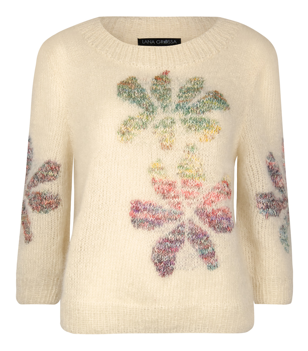 Das Tolle an diesem Modell sind nicht nur die großen, eingestrickten Blüten. Auch die Form ist genial, denn sie ist lässig und – dank schmaler Schultern – trotzdem schön feminin.