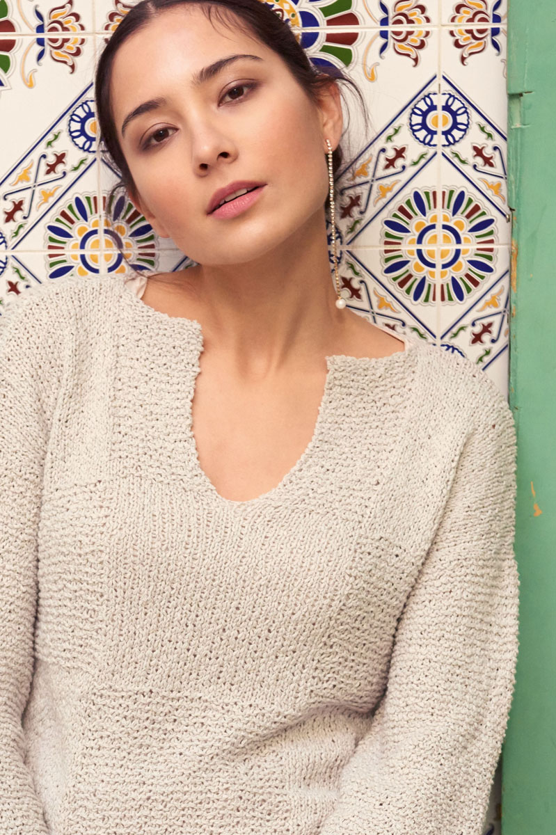 Lana Grossa-Qualität „4 Capi” (87 % Baumwolle, 13 % Polyamid, LL = ca. 135 m/50 g): ca. 400 (450 – 500) g Zartgrau (Fb. 9); Stricknadeln Nr. 4,5.