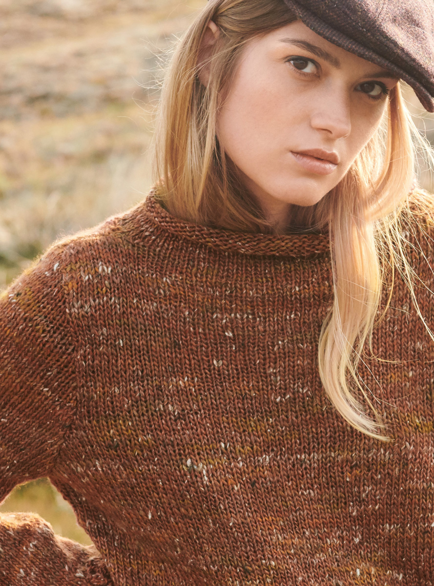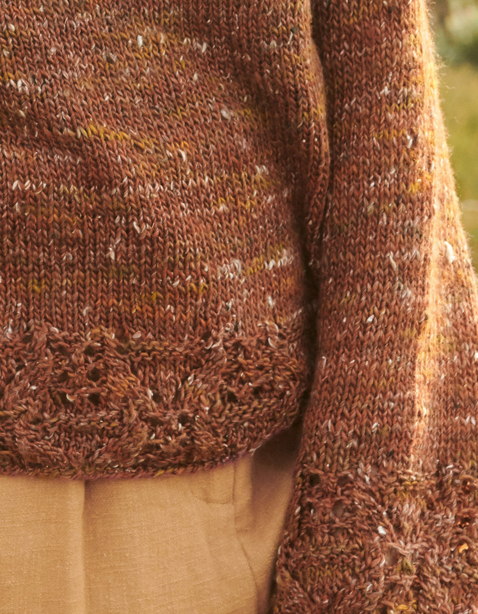 ZUSÄTZLICH ZUM TWEEDLOOK des Garns haben wir noch ein feines Lochmuster am Saum und an den Ärmeln hinzugefügt, sodass eine spannende Mischung aus rustikal mit feinen, femininen Details entsteht.