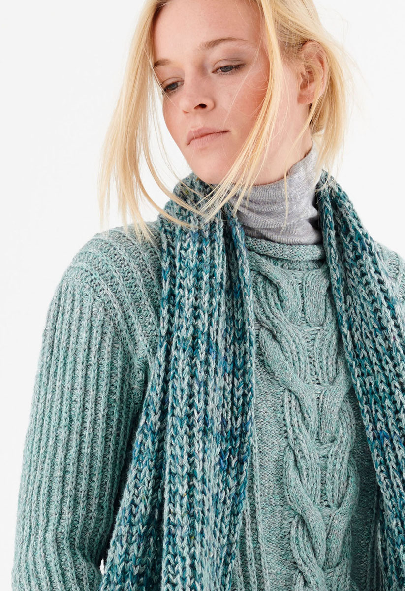 Lana Grossa-Qualität „Smokey“ (46 % Schurwolle (Merino), 41 % Baumwolle, 8 % Polyamid, 5 % Yak, Laufl änge ca. 225 m/50 g): ca. 350 (400 – 450) g Pastellpetrol/Hellgrau (Fb. 212); Stricknadeln Nr. 4 und 4,5, 1 Rundstricknadel Nr. 4,5, 40 cm lang.