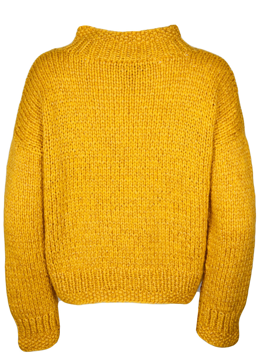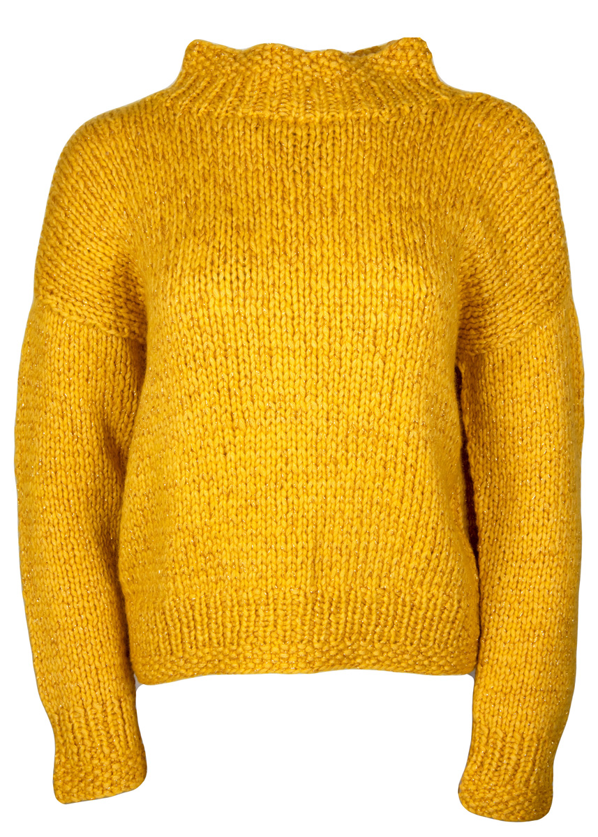 Sattes Gelb, voluminöses Garn, Lurex und ein weiter Turtleneck: Dieser Pulli bedient gleich vier Top-Trends auf einmal. Ein Hingucker sind auch die Blenden, die mit Perlmuster abschließen.
