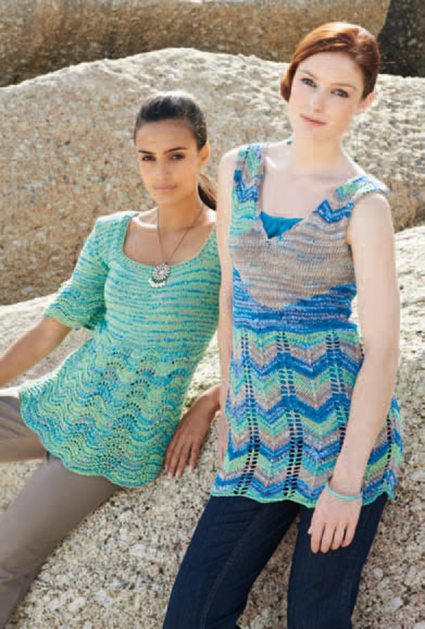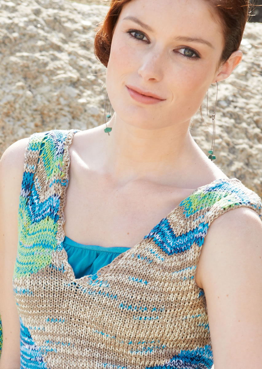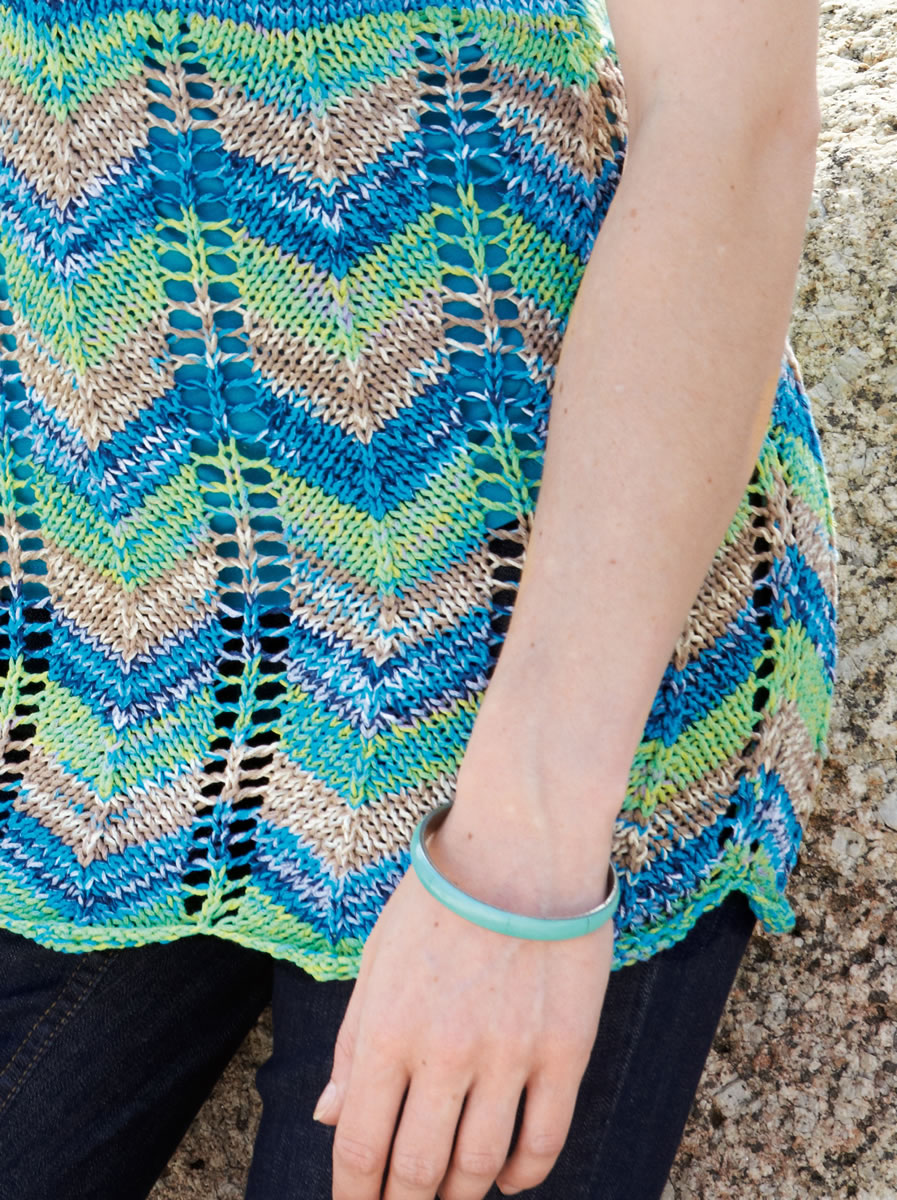 Lana Grossa-Qualität „Inside” (100 % Baumwolle, LL = ca. 150 m/50 g): ca. 400 (450) g Mauve/Lind-/Gelbgrün/Türkisblau (Fb. 9); Stricknadeln Nr. 4 und 4,5, 1 Rundstricknadel Nr. 3,5, 60 cm lang.