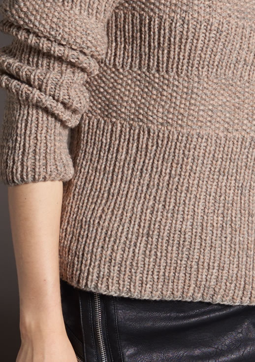 Lana Grossa-Qualität „Alta Moda Alpaca” (90 % (Baby) Alpaka, 5 % Schurwolle (Merino), 5 % Polyamid, LL = ca. 140 m/50 g): je ca. 250 (300) g Grau/Beige meliert (Fb. 15) und Pfirsich (Fb. 46); je 1 Rundstricknadel Nr. 6,5 und 7, 80 cm lang, 1 Rundstricknadel Nr. 6, 60 cm lang.