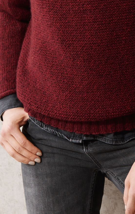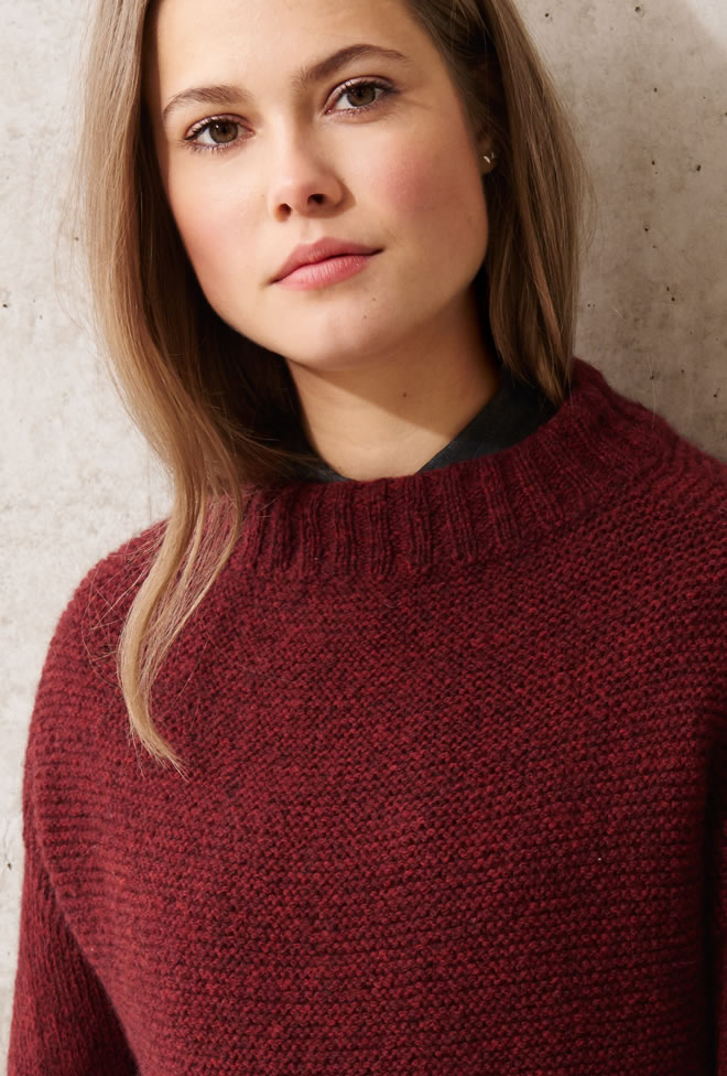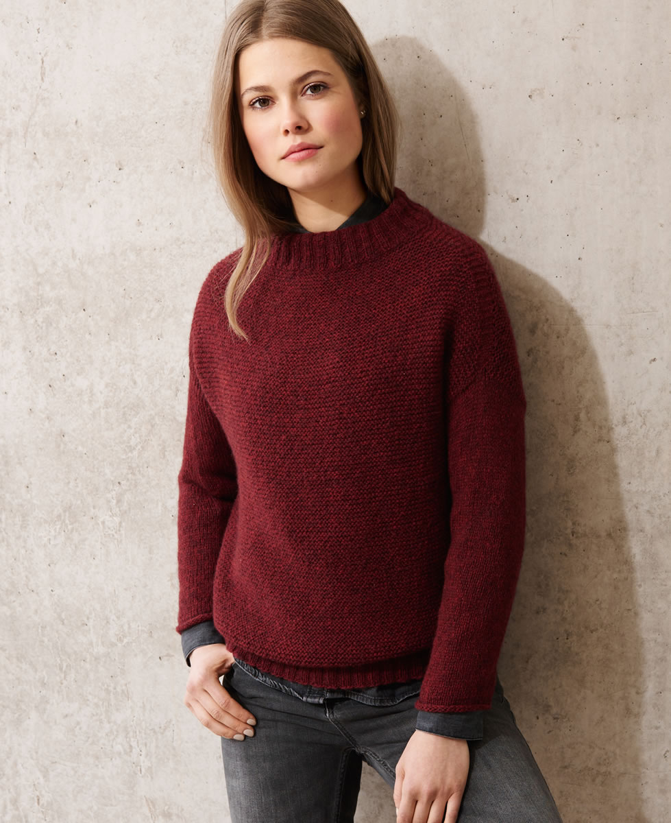 Lana Grossa-Qualität „Alta Moda Superbaby Fine” (63 % Schurwolle (Merino), 27 % Alpaka, 10 % Polyamid, LL = ca. 115 m/25 g): ca. 350 (375 – 400) g Dunkelrot (Fb. 3); Stricknadeln Nr. 3,5, 4 und 5, je 1 Rundstricknadel Nr. 4,5, 60 und 100 cm lang; 1 Rundstricknadel Nr. 4, 60 cm lang.
