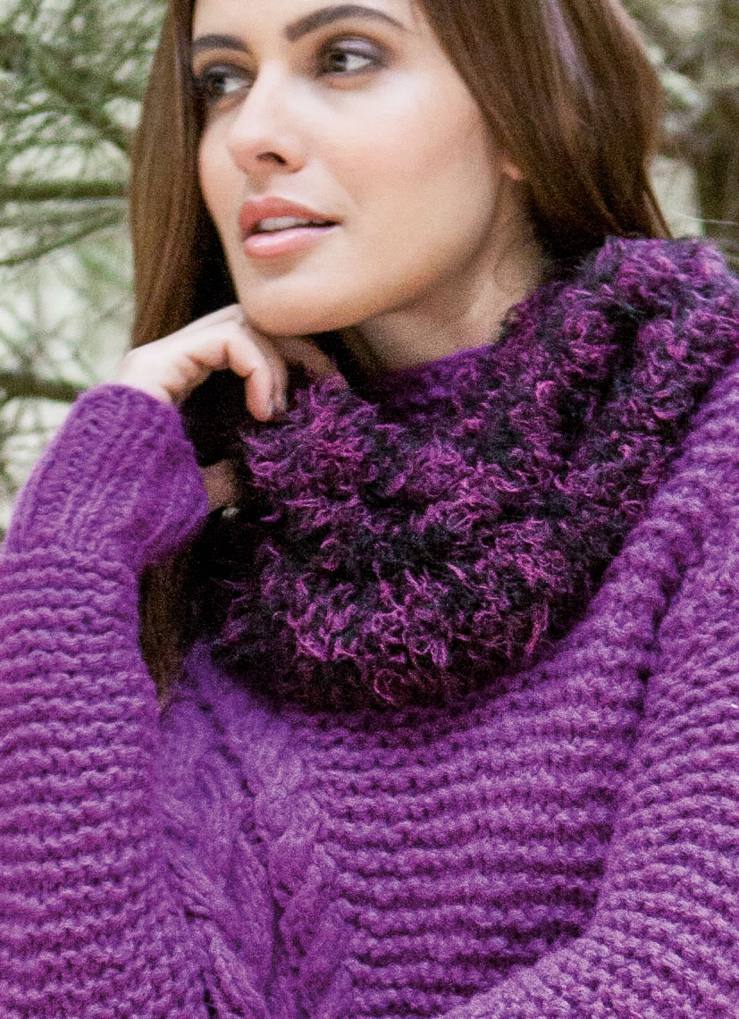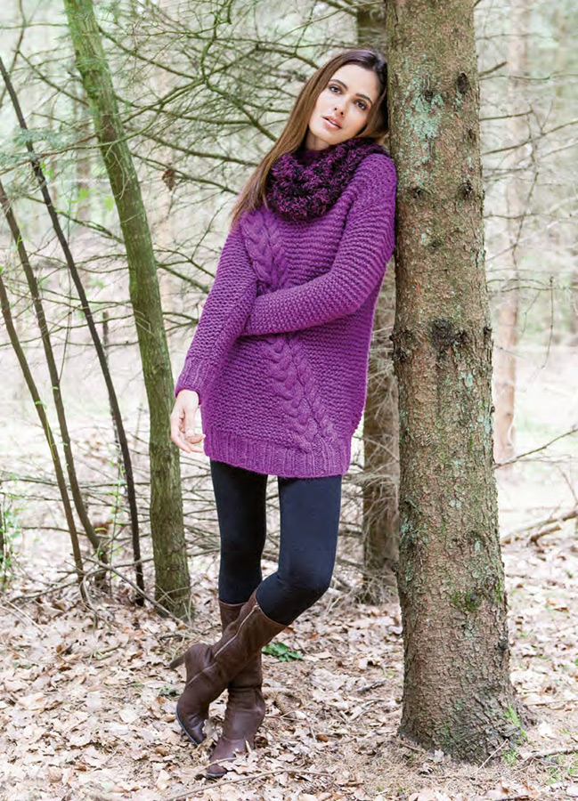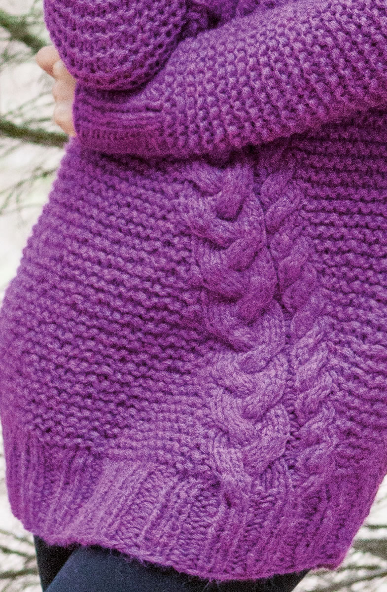 Lana Grossa „Garzato Baby” (65% Alpaca, 20% Schurwolle, 15% Polyamid, LL = 70 m/50 g) 600 g Zyklam (Fb 18), Stricknadeln Nr. 9 und 10, eine kurze Rundstricknadel Nr. 10.
