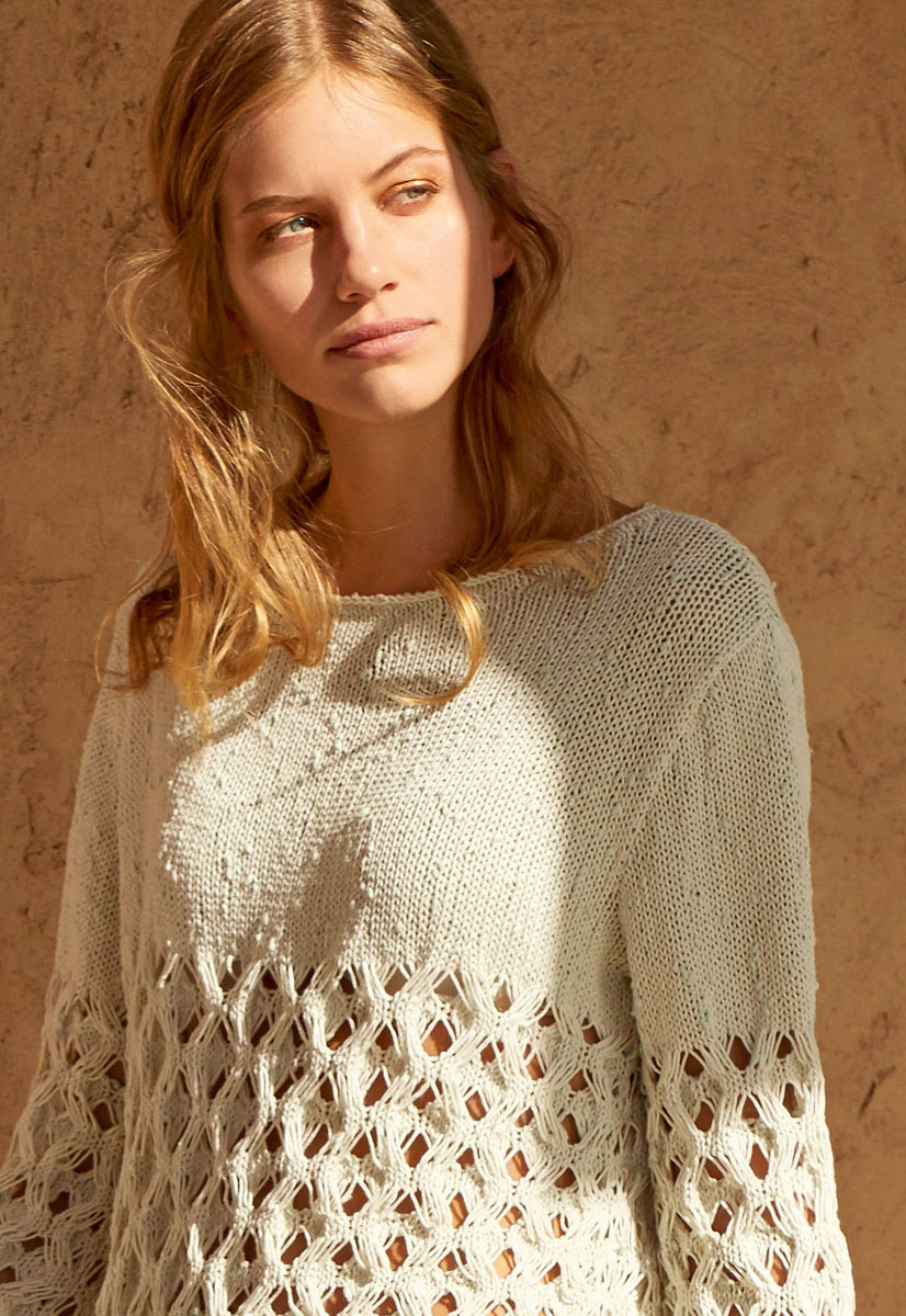 Lana Grossa-Qualität „Bottone” (94 % Baumwolle, 6 % Polyamid, LL = ca. 120 m/50 g): ca. 500 (550) g Zartgrün (Fb. 5); Stricknadeln Nr. 5 und 5,5, 1 Rundstricknadel Nr. 5, 60 cm lang.