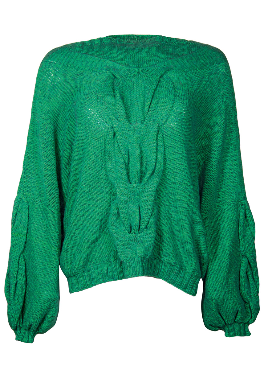 Die weich fallenden Zöpfe wirken wie drapiert, der hohe, gerade Ausschnitt setzt einen strengen, grafischen Akzent: Ein Statement- Pulli mit Couture-Allure!