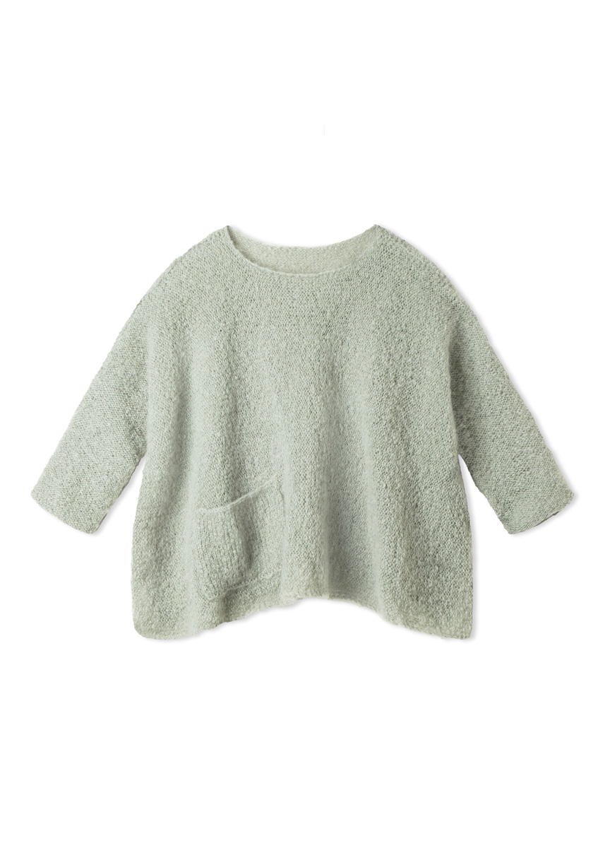 Lana Grossa-Qualität „Mohair Moda” (70 % Mohair (Kid Mohair), 20 % Schurwolle (Merino superfine), 10 % Polyamid, LL = ca. 140 m/50 g): ca. 300 (350 – 400) g Graugrün (Fb. 3); Stricknadeln Nr. 5,5, Spielstricknadeln Nr. 4 und 5.