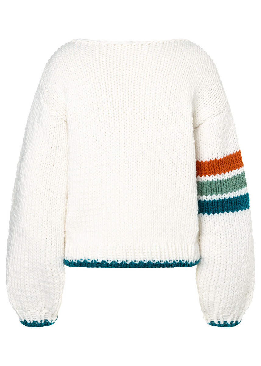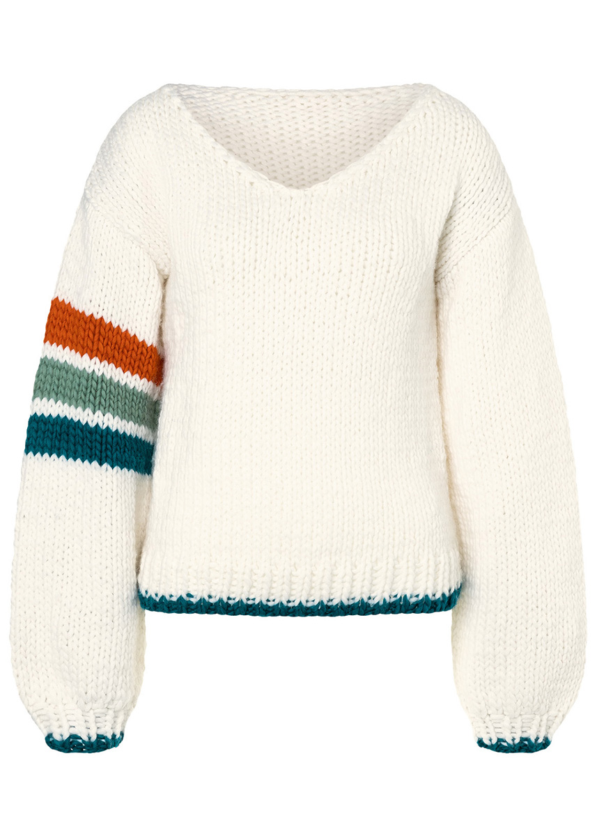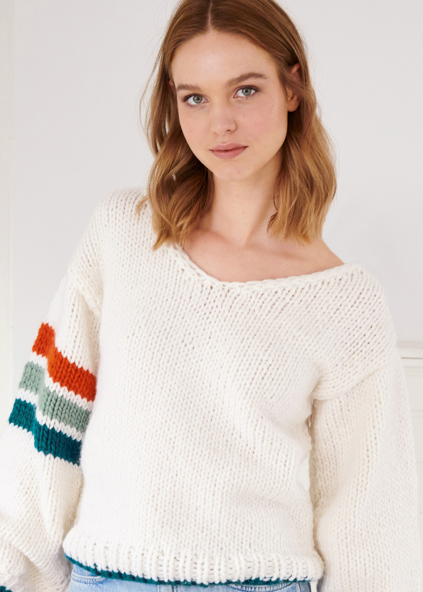 Der glatt rechts gestrickte Pulli ist die Gelegenheit, um Ringel und farbige Kanten zu üben. Der VAusschnitt entsteht durch Abnahmen. Auf eine Blende haben wir bei ihm bewusst verzichtet. Wir finden, dass es auch ohne gut geht – und außerdem viel einfacher.