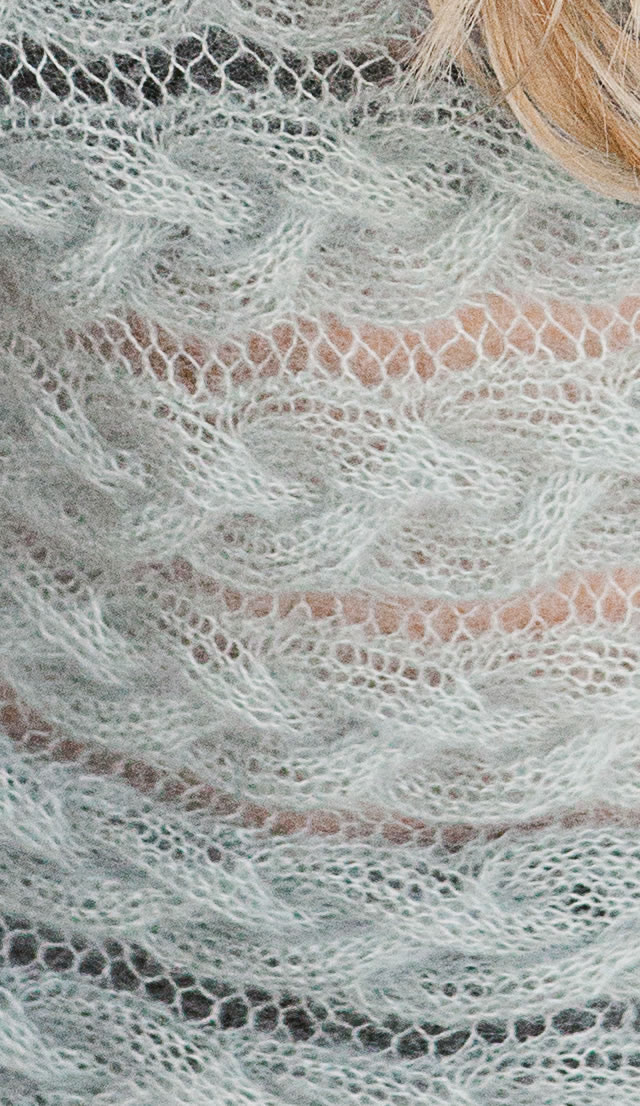 Lana Grossa Silkhair (70 % Mohair, 30 % Seide, Lauflänge 210 m/25 g) 150 (150/175) g Grüngrau (Fb 81); Stricknadeln Nr. 4, Häkelnadel Nr. 3,5