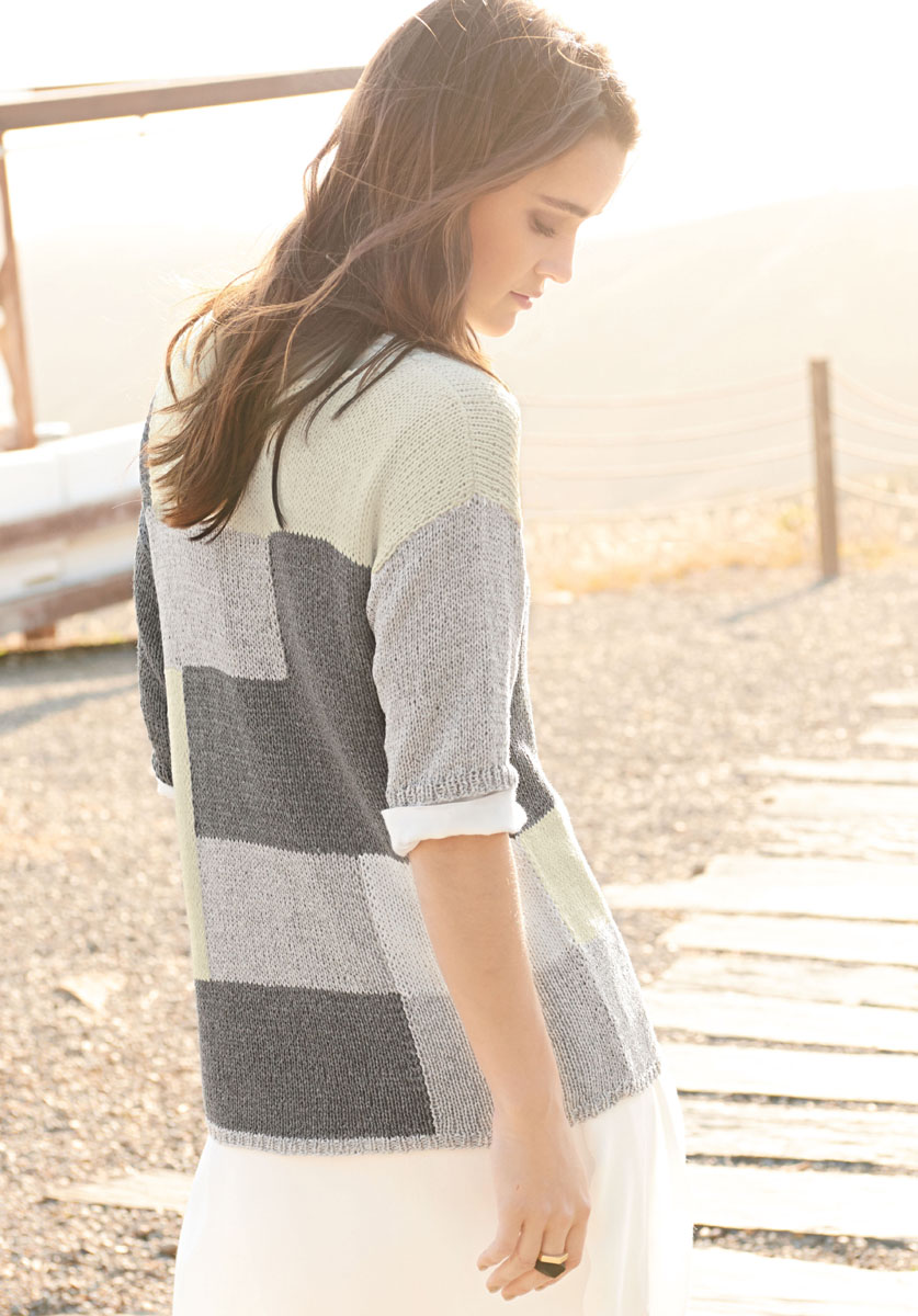 Lana Grossa Solo Lino Mélange (80 % recyceltes Leinen (Viskose), 20 % Leinen, Lauflänge 105 m/50 g) 150 (200 - 250) g Natur meliert (Fb 101), 150 (200 - 250) g Grau meliert (Fb 102) und 150 (200 - 250) g Dunkelgrau meliert (Fb 111); Stricknadeln Nr. 4,5 und 5, Häkelnadel Nr. 5.