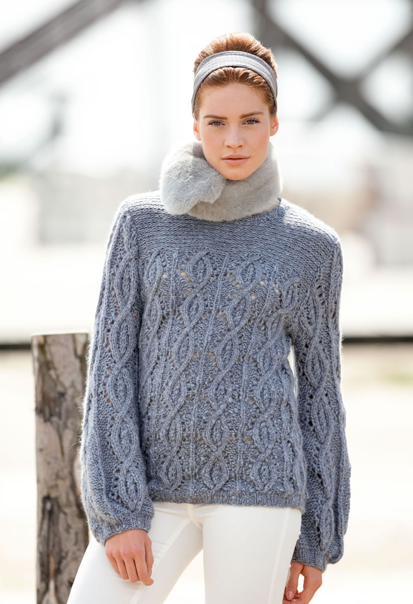 Fliederfarbenes Flauschgarn, eine kraus gestrickte Schulterpasse und zarte Ajour-Muster: Auch der Winter braucht romantische Momente.