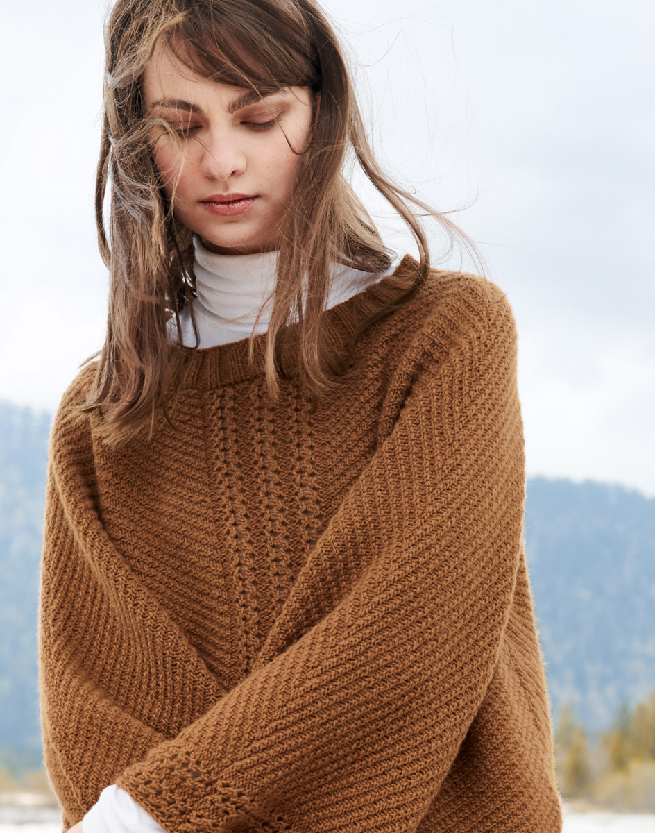 Lana Grossa 100% Cashmere Fine (100% Kaschmir, Lauflänge 87 m/25 g), 500 (525 -550) g Karamell (Fb 28); Stricknadeln Nr. 3,5 und 1 Rundstricknadel Nr. 3,5, 40 cm lang.