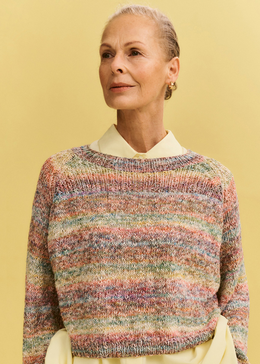 Lana Grossa-Qualität „About Berlin Vanity“ (54 % Baumwolle, 21 % Viskose, 13 % Seide, 12 % Polyamid, Lauflänge 100 m/50 g): ca. 450 g Lachs/ Graugrün/Vanille/Graublau/Violett bunt (Fb. 4); Stricknadeln Nr. 3,5 und 5, 1 Rundstricknadel Nr. 3,5, 50 cm lang.