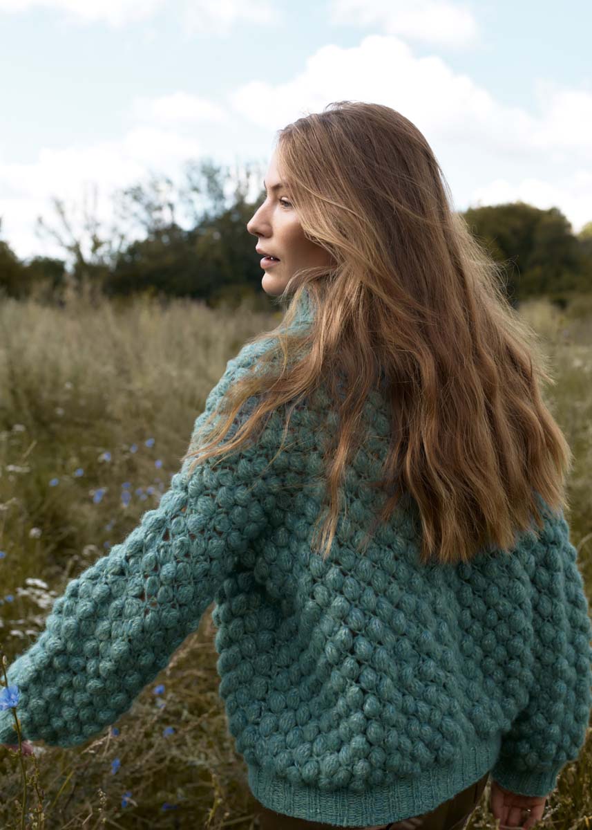 XL-Noppen (supereinfach!) verleihen unserem mintgrauen Leichtgewicht eine spektakuläre Optik. Seine voluminöse Silhouette entsteht durch fest gestrickte Rippenbündchen.