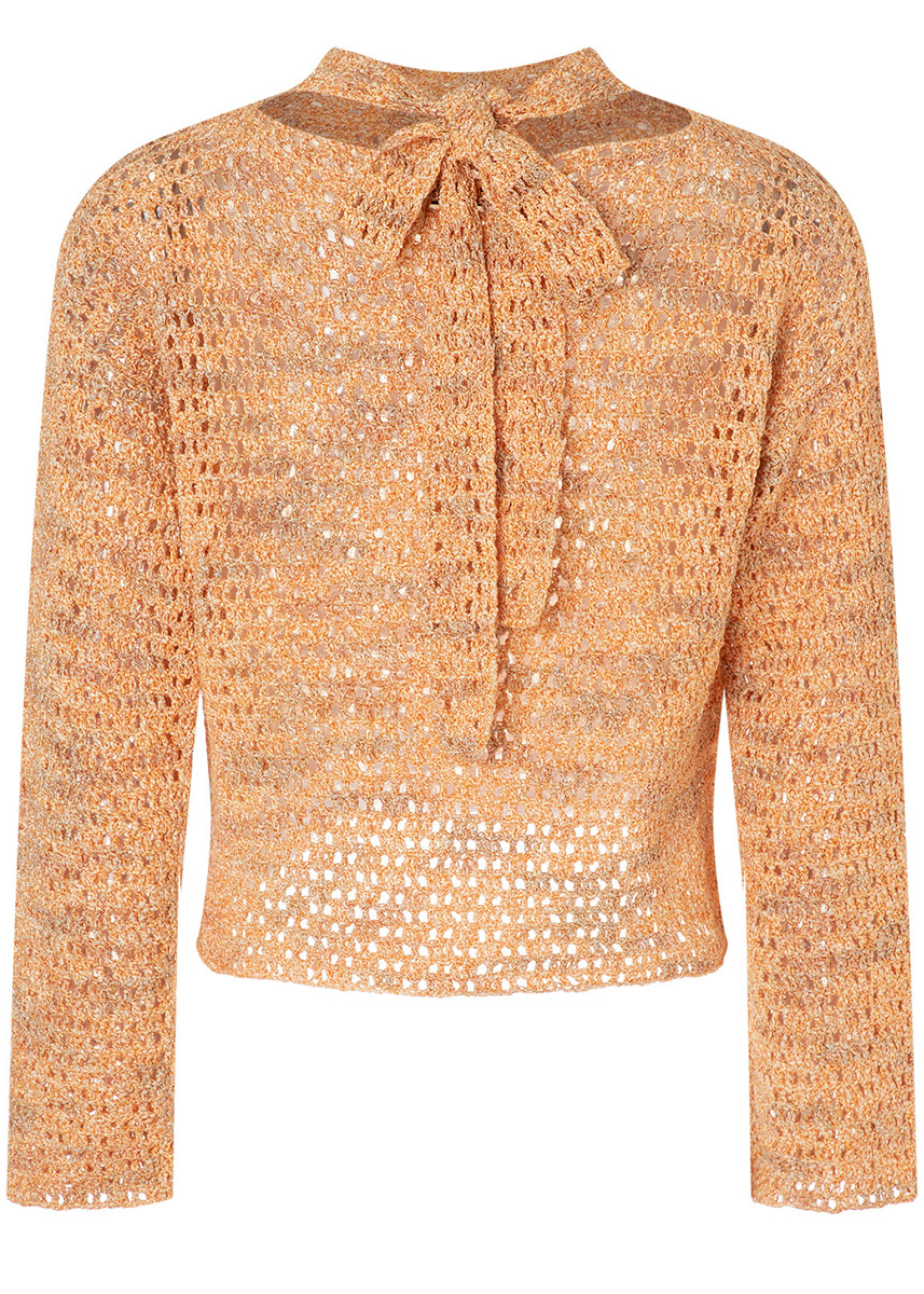 Dieser Filetmusterpullover hat eine kastige Silhouette und einen eckigen Ausschnitt. Der Clou ist die fünf Zentimeter breite Schluppe, die ihm entspannten Chic verleiht.