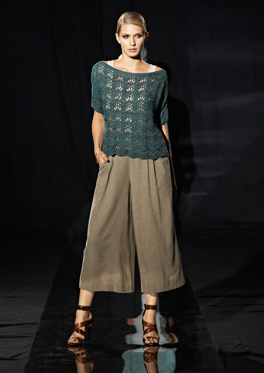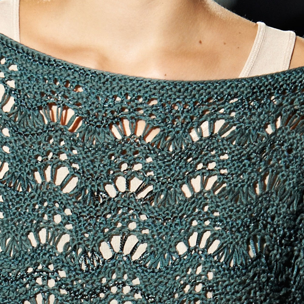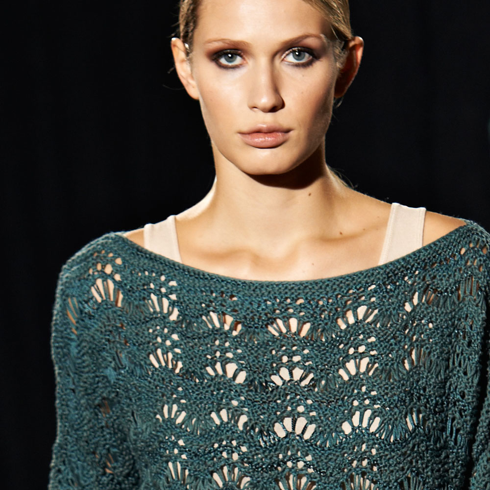 Lana Grossa Allegro Unito (58 % Viskose, 42 % Baumwolle; Lauflänge 115 m/50 g) 350 g Graugrün (Fb 108); Stricknadeln Nr. 5; Häkelnadel Nr. 4.