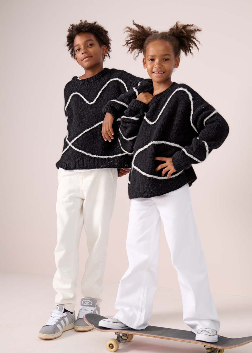 Lana Grossa-Qualität „Alpaca Air“ (62% Alpaka (Baby), 27% Polyamid, 11% Schurwolle (Merino Fine), LL = ca 140 m/50 g): ca 200 (250 - 250 - 300) g Schwarz (Fb 12), ca 50 (50 - 50 - 50) g Rohweiß (Fb 1); Stricknadeln Nr 5 und Nr 6; kurze Rundstricknadel Nr 5; Häkelnadel Nr 6.