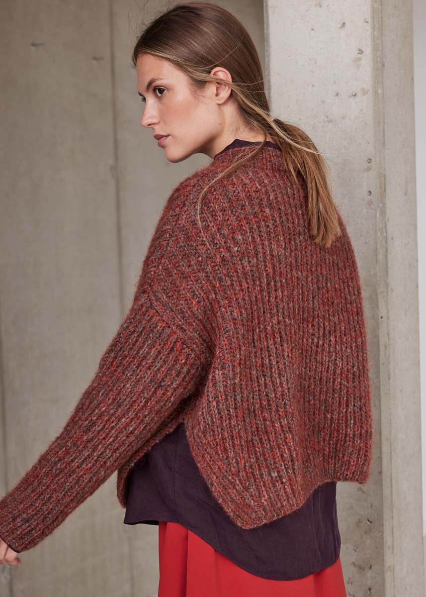 Lana Grossa Alpaca Air II (50% Alpaka (Baby), 27% Polyamid,14% Baumwolle, 9% Schurwolle (Merino), Lauflänge 140 m/50 g), 300 (300 - 350) g in Graubraun (Fb 32) und Lana Grossa Silkhair (70% Mohair (Superkid), 30% Seide, Lauflänge 210 m/25 g), 125 (125 - 150) g in Leuchtendrot (Fb 215); Stricknadeln Nr 4,5; 1 Rundstricknadel Nr 4,5, 50 cm lang.