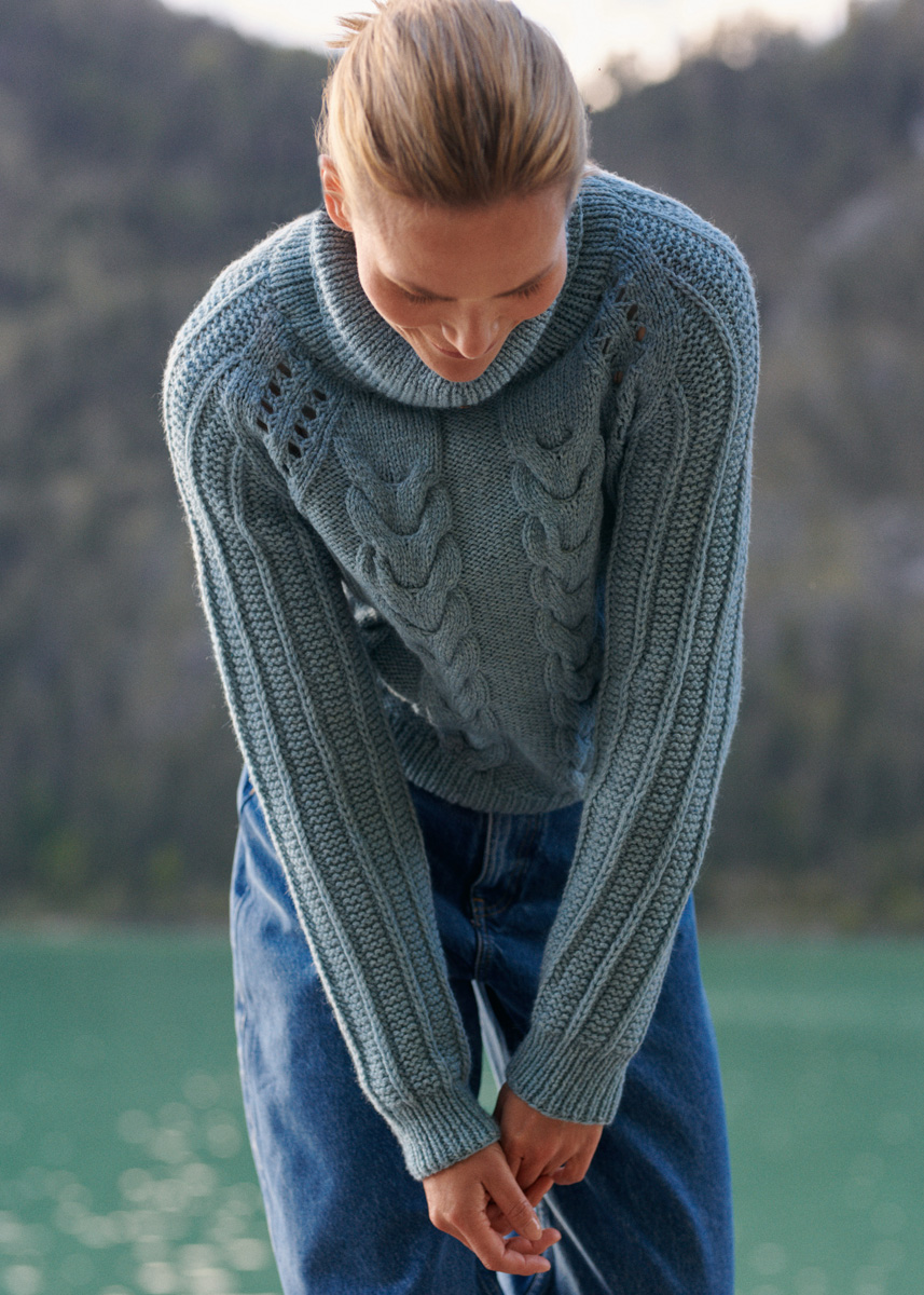 Rippenstrukturen für die Ärmel, Lochmuster für die Raglanschrägen und breite Zöpfe für Vorder-und Rückteil: Dieser Rolli ist eine Wucht – und wirkt in hellem Jeansblau besonders chic.