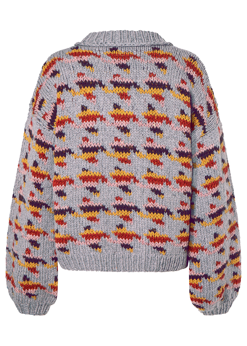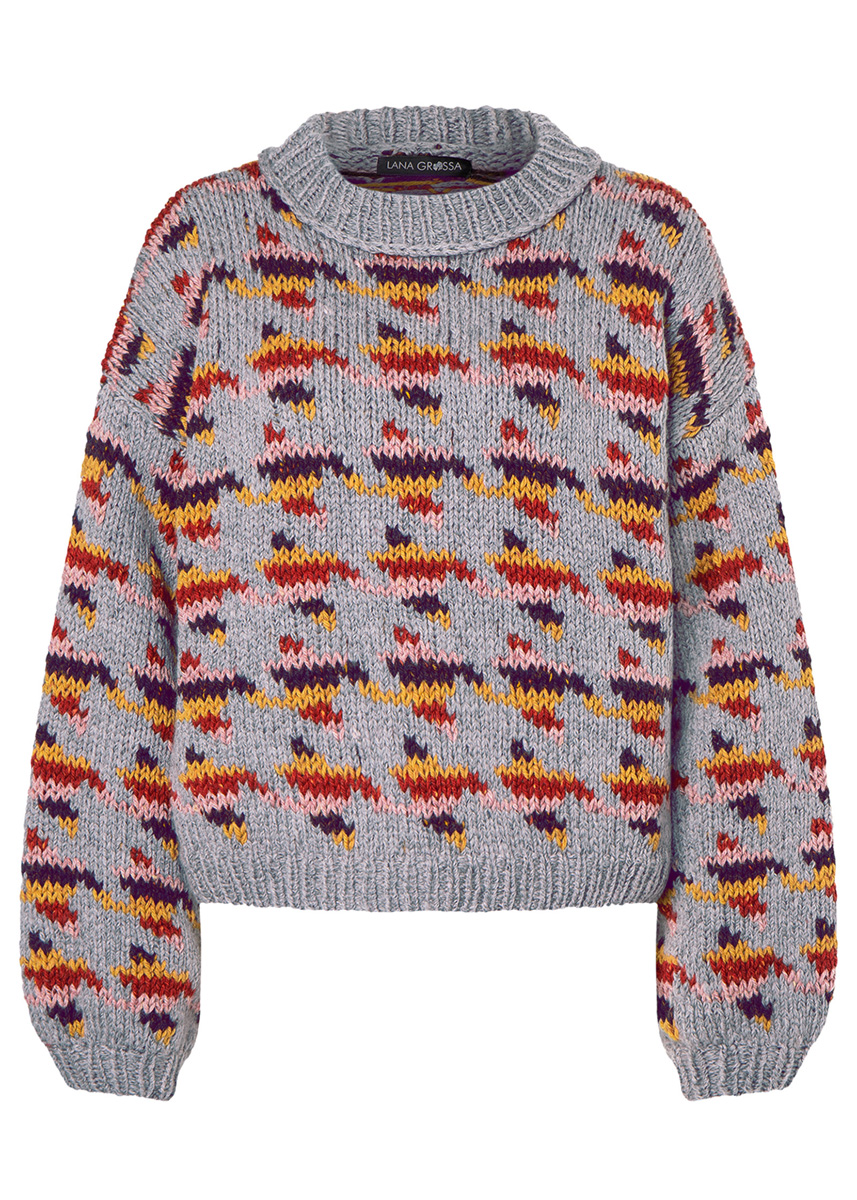 Lana Grossa Alta Moda Cashmere 16 (78% Schurwolle (Merino), 12% Kaschmir, 10% Polyamid, Lauflänge 110 m/50 g), 400 (450 – 500) g Mauve (Fb 61) und Lana Grossa Landlust Soft Tweed 90 (100% Schurwolle, Lauflänge 90 m/50 g), 100 g Goldbraun meliert (Fb 8), 100 g Mokka meliert (Fb 10), 100 g Altrosa meliert (Fb 12) und 100 g Rot meliert (Fb 11); Stricknadeln Nr. 7 und 8, 1 Rundstricknadel Nr. 7, 40 cm lang.