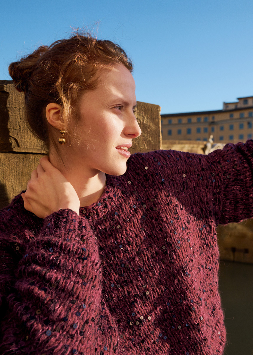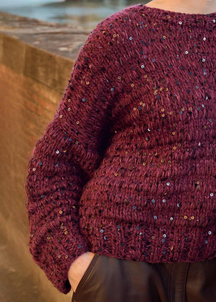 Unser Pullover überzeugt mit unterschiedlich großen Pailletten und einem Fallmaschenmuster über drei Reihen. Das Modell wird dreifädig gestrickt und besteht aus einfachen, geraden Teilen.