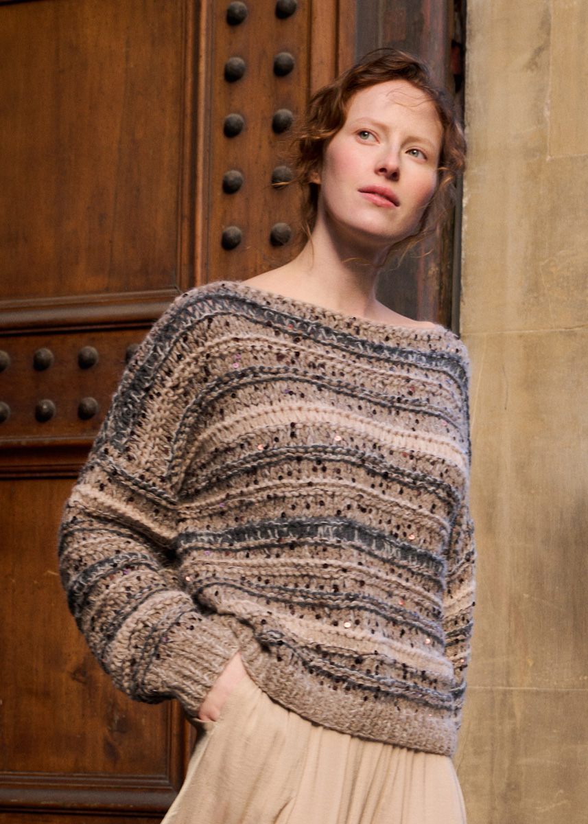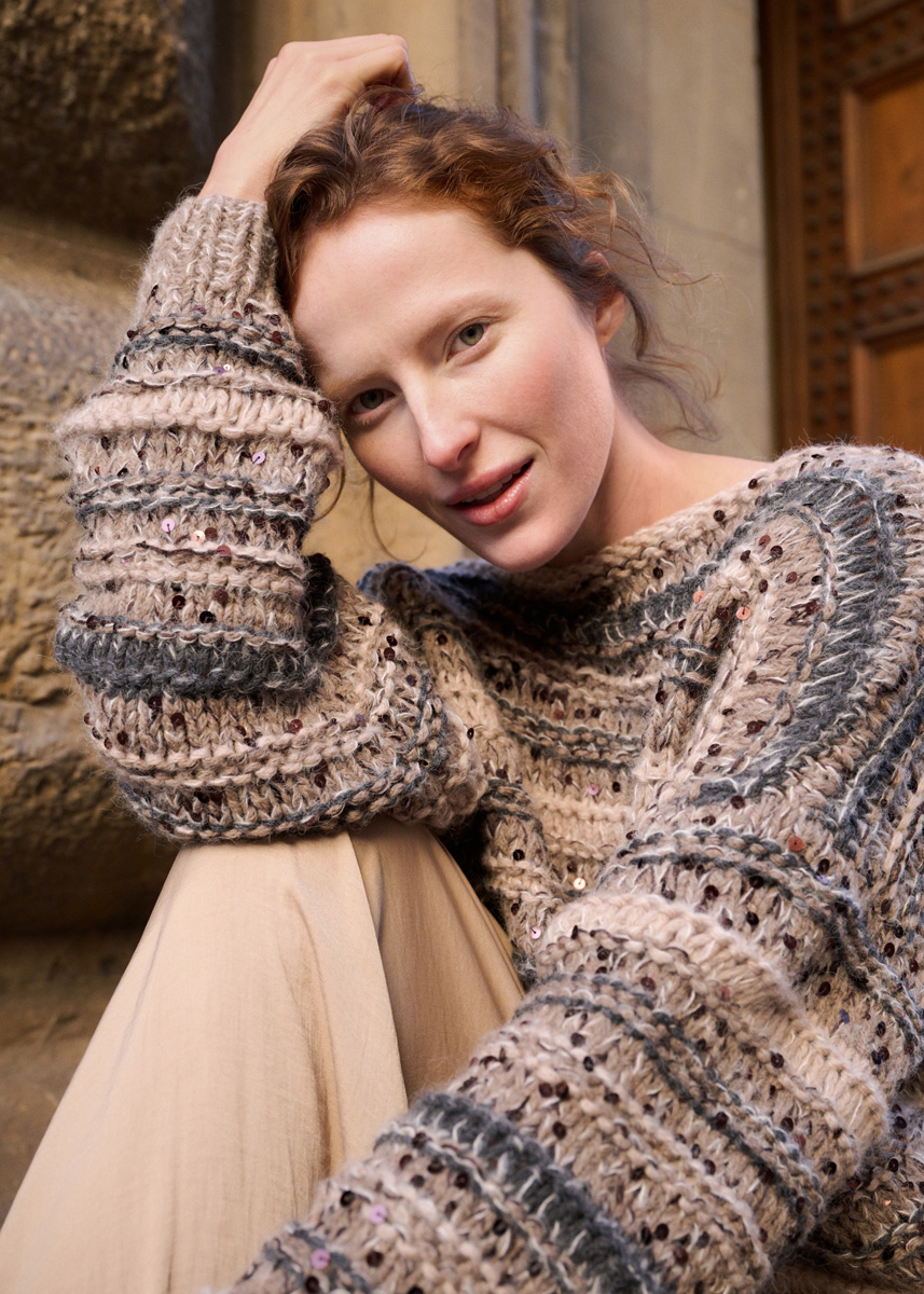 Dieser Pullover wird mal zwei- und mal dreifädig, mit Nadelstärke Neun gestrickt. Spannung kommt über den Mix aus Pailletten, fünf edle Naturtöne und eine Struktur aus kraus und glatt rechts gestrickten Maschen. Die Kombination der Fäden ist bei den Mustern für jede Reihe angegeben.