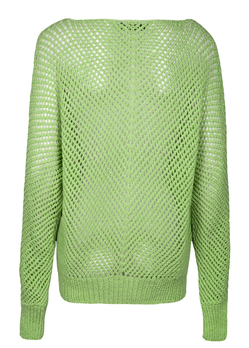 Apfelgrün und zarte Bräune sind immer ein schönes Paar. Das Netzmuster unterstreicht den WOW-Effekt. Es wird von der Mitte aus gestrickt. So wirkt es sehr grafisch und supermodern.
