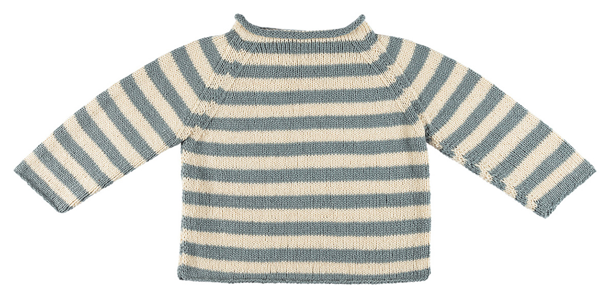 Lana Grossa Alta Moda Cotolana (45% Schurwolle Merino, 45% Pima Baumwolle, 10% Polyamid, Lauflänge 150 m/50 g), 100 (150 – 150) g Grüngrau (Fb 9) und 100 (150 – 150) g Ecru (Fb 20); Stricknadeln Nr. 3,5 und 4, 1 Rundstricknadel Nr. 3,5, 40 cm lang.