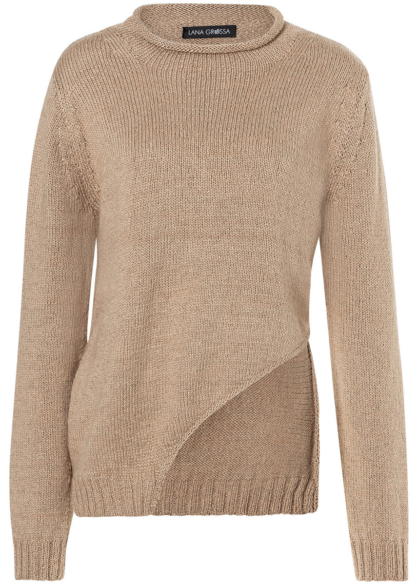 Schmale Schultern, ein schmeichelnder Stehkragen und ein asymmetrisches Vorderteil, das lange Beine zaubert: Dieser Pulli ist gut zur Figur.