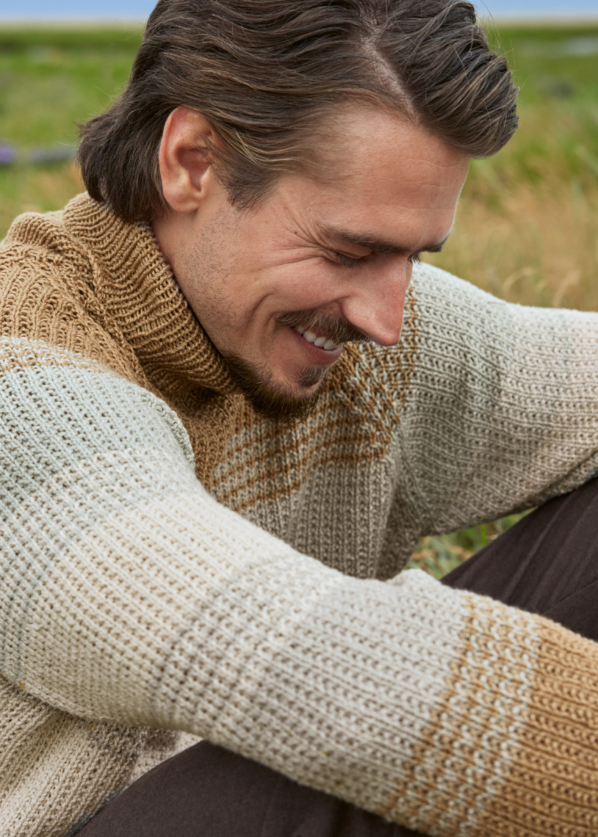 Lana Grossa Alta Moda Cotolana (45% Schurwolle (Merino), 45% Baumwolle (Pima), 10% Polyamid, Lauflänge 150 m/50 g), 200 (250 – 300) g Grège (Fb 8), 150 (200 – 250) g Hellbeige (Fb 19) und 150 (200 – 250) g Camel (Fb 38); Stricknadeln Nr. 4 und 4,5 und 1 Rundstricknadel Nr. 4, 40 cm lang.