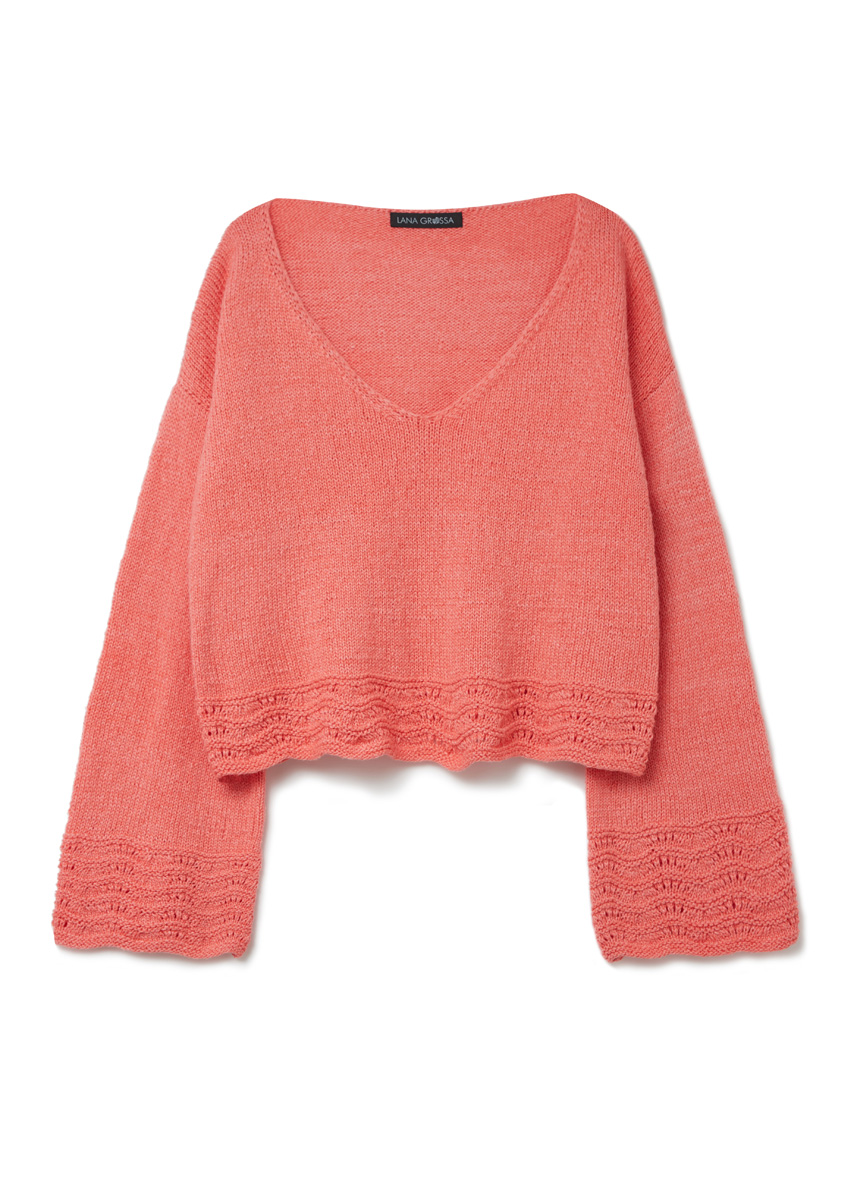 Lana Grossa Alta Moda Cotolana (45% Schurwolle (Merino), 45% (Pima) Baumwolle, 10% Polyamid, Lauflänge 150 m/50 g), 400 (450 – 500) g Koralle (Fb. 52); Stricknadeln Nr. 4,5 und 1 Häkelnadel Nr. 4.