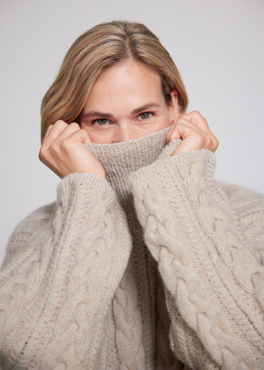 Turtleneck, Kastenform, OversizeÄrmel und Trendfarbe Offwhite: Hier wurde der Zopfmuster-Pulli wunderbar modern inszeniert.