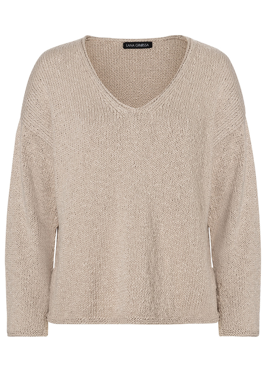 Eine asymmetrische Silhouette (hinten länger als vorne), betonte Abnahmen (V-Ausschnitt) und ein lebhaft strukturiertes Baumwollgarn: Subtile Details machen diesen Sweater zum Highlight.