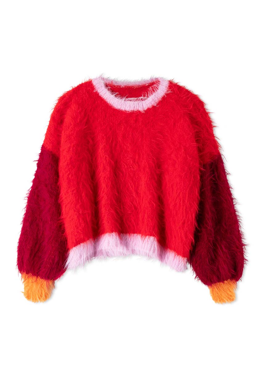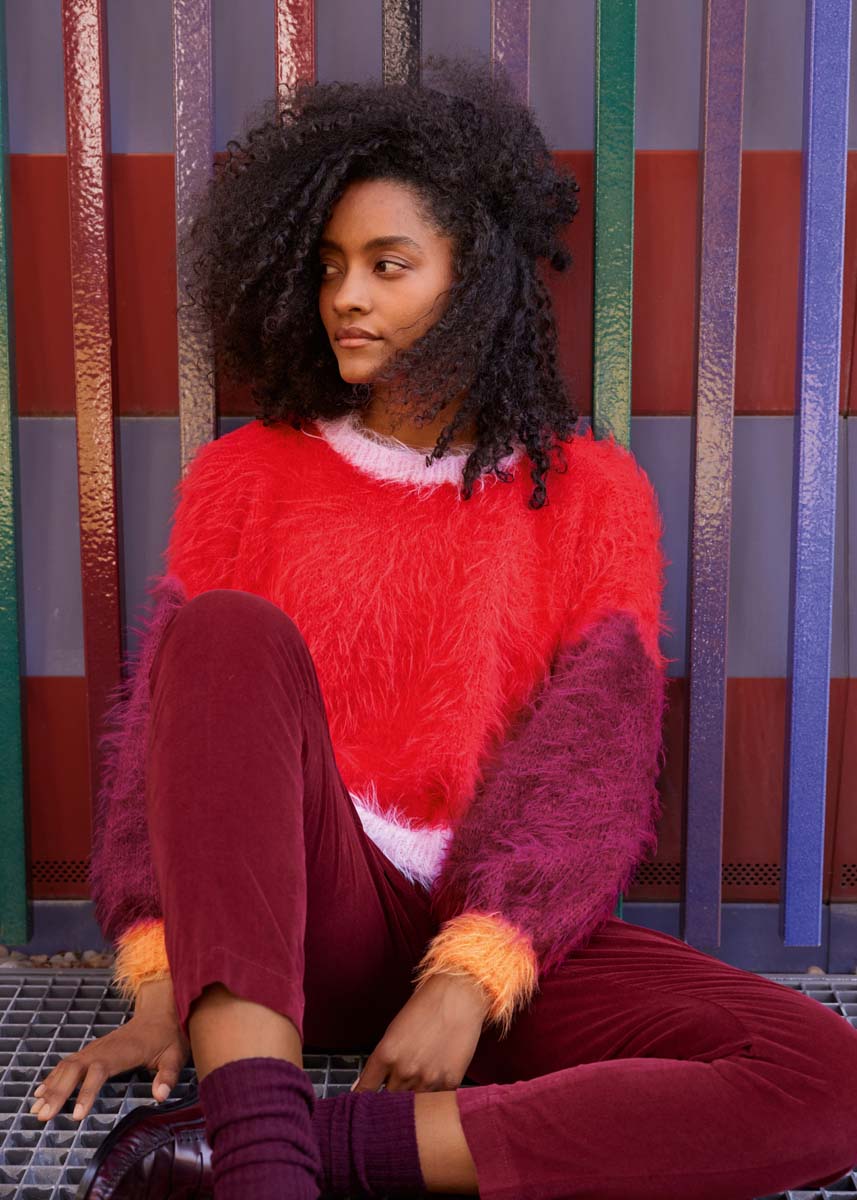 Sinnlicher Faux-Fur, markante Farbblöcke und Farben, die sich ein bisschen beißen: Beim simpel gestrickten OVERSIZE-PULLI sorgen die Kontraste für Hochspannung