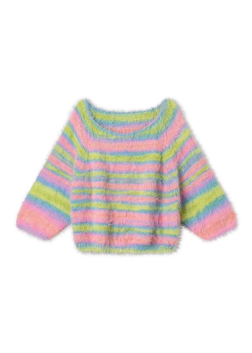 Lana Grossa-Qualität „Basta Mista“ (50 % Schurwolle (Merino), 50 % Polyamid, LL = ca 100 m/50 g): 400 (400 - 450 - 500) g Limette/Türkis/Aqua/Lachs/Rosa/ Flieder (Fb 113); kurze und lange Rundstricknadel Nr 5 und Nr 6; Maschenmarkierer.