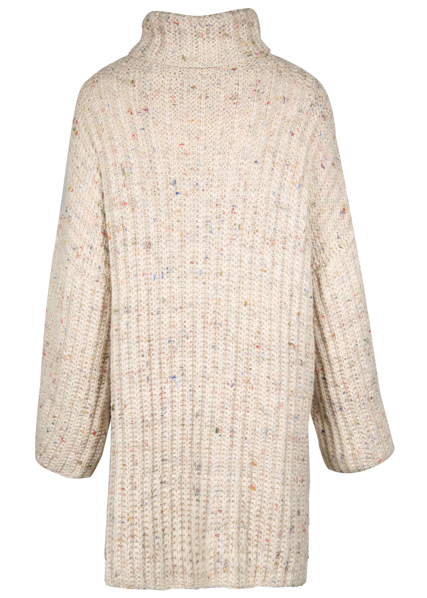 Lana Grossa „Benessere Tweed“ (45% Baumwolle, 24% Baby Alpaka, 20% Polyamid, 7% Polyacryl, 4% Viskose; Lauflänge ca. 125 m/50 g), 750 (800/850) g in Natur meliert (Fb 101); Stricknadeln Nr. 6, sowie eine Rundstricknadel Nr. 6 in 40 cm Länge, Maschenmarkierer.