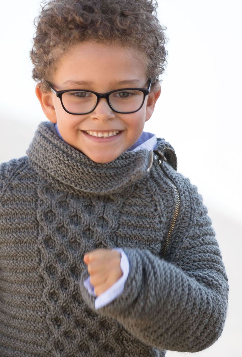 Lana Grossa Bingo (100% Schurwolle, Lauflänge 80 m/50 g), 550 (600) g Dunkelgrau meliert (Fb 120); Stricknadeln Nr. 5,5, je 1 Rundstricknadel Nr. 5 und 5,5, 40 cm lang, 1 Zopfnadel, 1 Reißverschluss von PRYM; Type 10, M4, Fb 004, Metall silber, 30 cm lang, Reißverschlussanhänger: 482 173.
