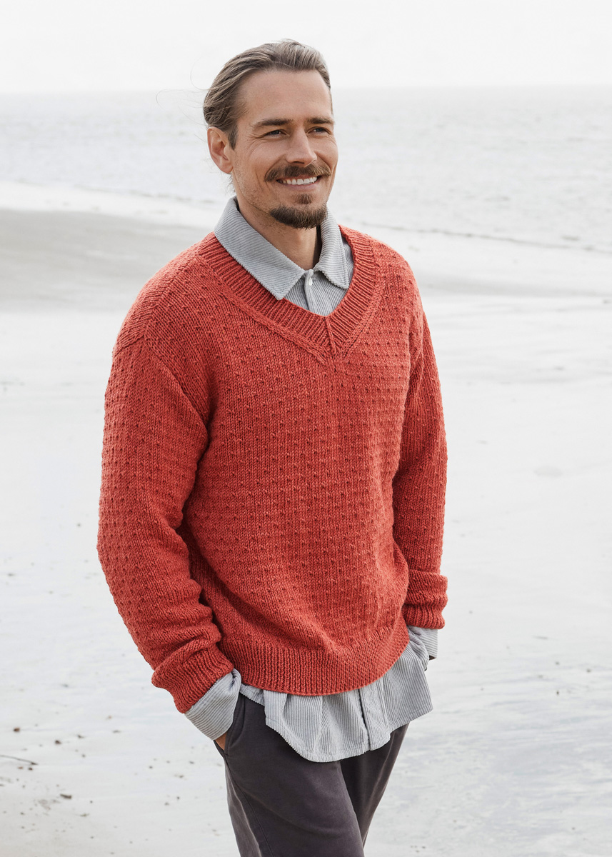 Lana Grossa Bingo Mélange (100% Schurwolle, Lauflänge 80 m/50 g), 850 (900 – 950) g Rot meliert (Fb. 1031); Stricknadeln Nr. 3,5 und 5,5, sowie 1 Rundstricknadel Nr. 3,5.