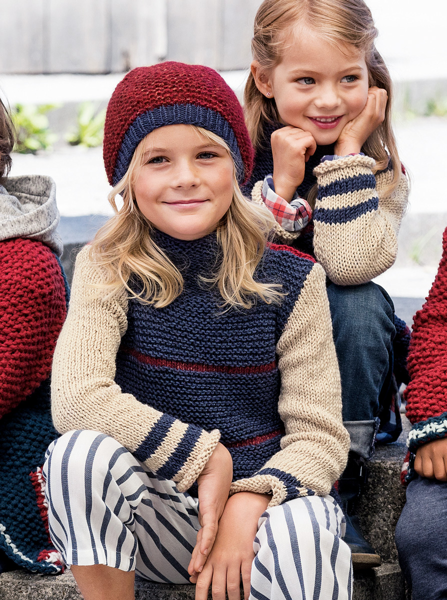 Lana Grossa Bingo Melange (100% Schurwolle, Lauflänge 80 m/50 g), 100 (100 – 150 – 150) g Nachtblau meliert (Fb 251), 100 (100 – 150 – 150) g Dunkelrot meliert (Fb 226) und 100 g Beige meliert (Fb 249) und Lana Grossa Lala Berlin Shiny (46% Baby Alpaka, 30% Baumwolle, 8% Schurwolle Merino, 8% Polyester, 8% Polyamid, Lauflänge 150 m/50 g), 50 g Dunkelrot (Fb 4); Stricknadeln Nr. 5,5, 1 Rundstricknadel Nr. 5,5, 40 cm lang