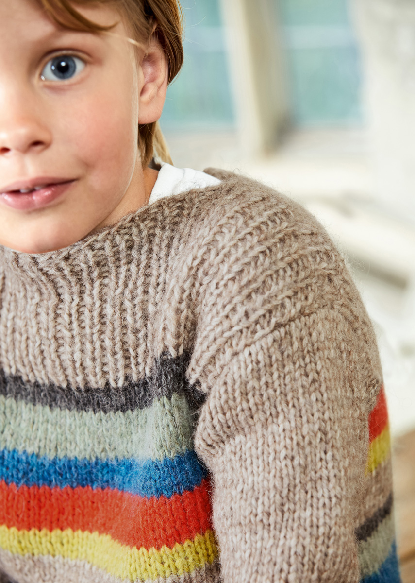 Lana Grossa Brigitte No. 2 (47 % Baby Alpaka, 45 % Baumwolle, 8 % Schurwolle Merino, Lauflänge 140 m/50 g), 100 (150 – 200) g Beige (Fb 15), 50 g Schiefer (Fb 24), 50 g Graugrün (Fb 18), 50 g Petrol (Fb 22), 50 g Koralle (Fb 25) und 50 g Grüngelb (Fb 17); Stricknadeln Nr. 5 und 6.